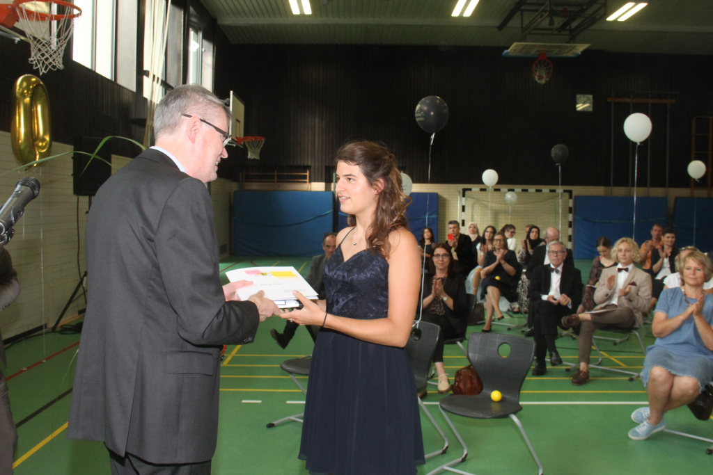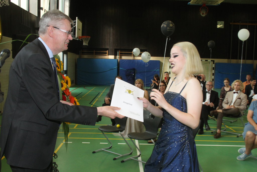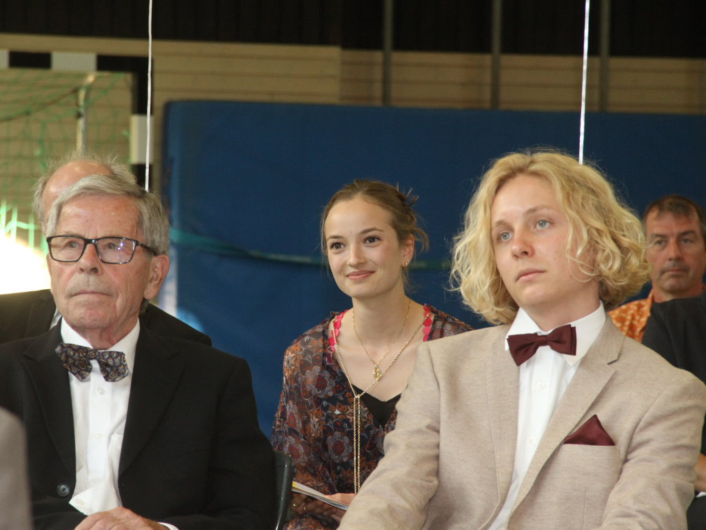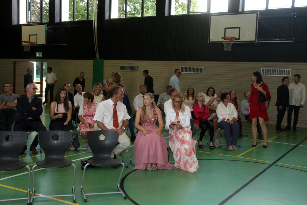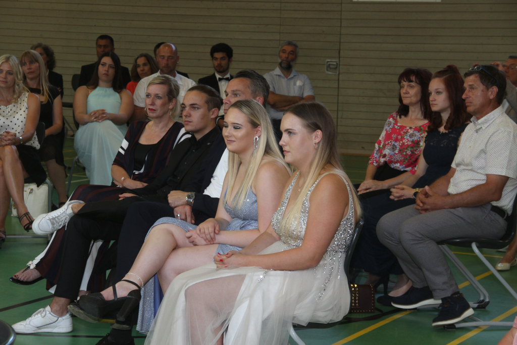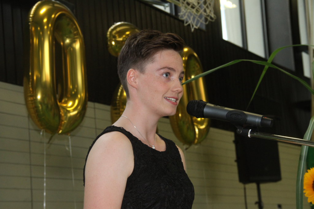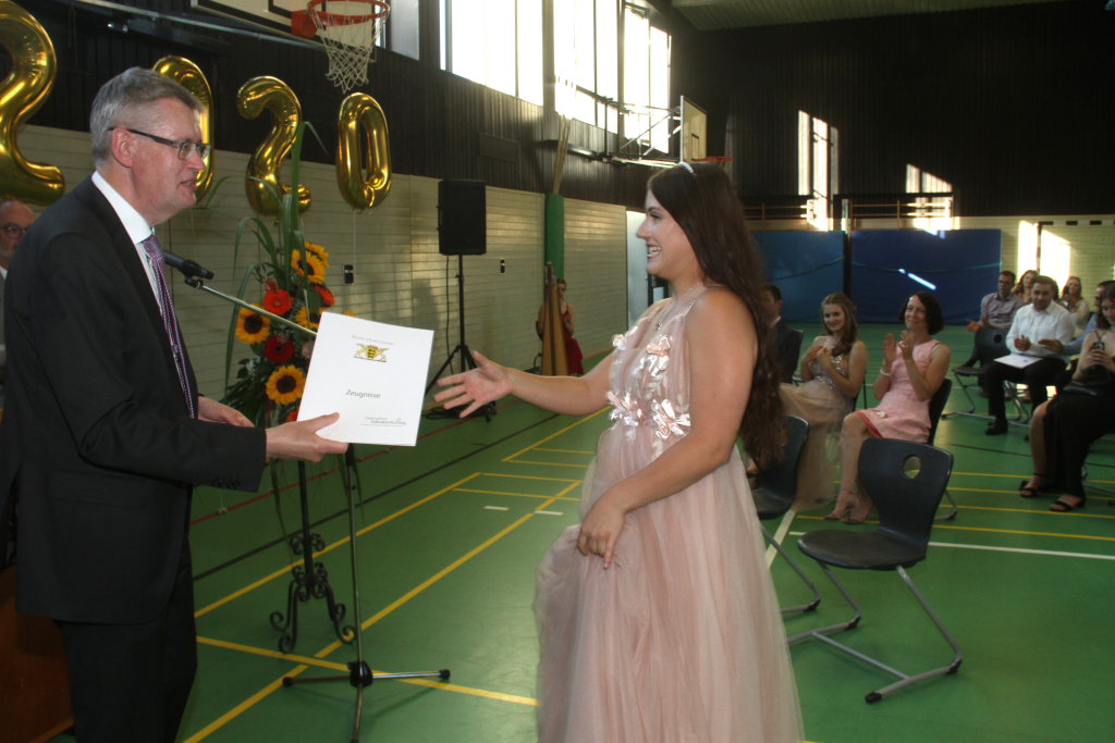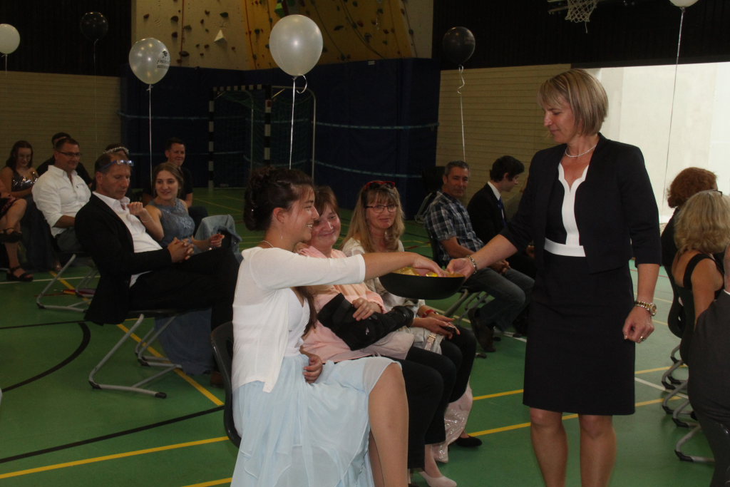 Als Vertreter der Abiturienten sprachen Alexa Gragnato, David Kling und Lukas Bettrich auf den drei Feierstunden. Gragnato ging acht Jahre zurück, als man sich ebenfalls in der Turnhalle bei der Einschulungsfeier zum ersten mal traf. Das Gefühl sei in etwa dasselbe geblieben: Die Freude es geschafft zu haben, die Angst vor neuen Herausforderungen, die Motivation neue Dinge zu lernen, Neues zu erfahren, die Zuversicht sich durch alle Schwierigkeiten irgendwie durchzuboxen. „Aber behaltet immer im Hinterkopf; wir haben den Matheunterricht überstanden, also können wir verdammt nochmal alles Überstehen.“ Hier hätten die meisten Freunde, vielleicht sogar die besten Freunde gefunden. „Diese Schule hat uns zusammengeschweißt, anders kann ich es nicht ausdrücken.“ Vor nicht allzu langer Zeit seien die Wunschberufe Prinzessin, Cowboy oder Pirat gewesen, jetzt wurde plötzlich von einem erwartet, sich für echte Berufe zu entscheiden und seine Stärken zu finden.