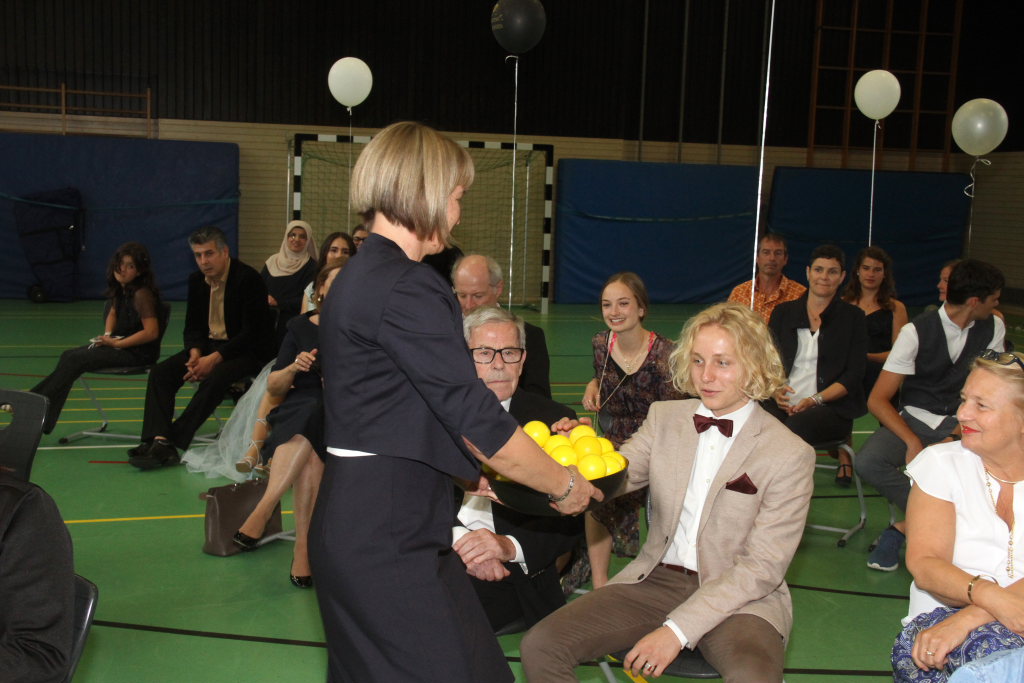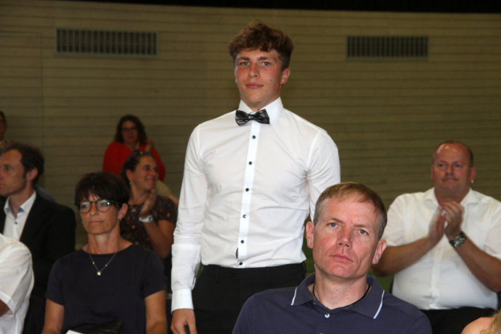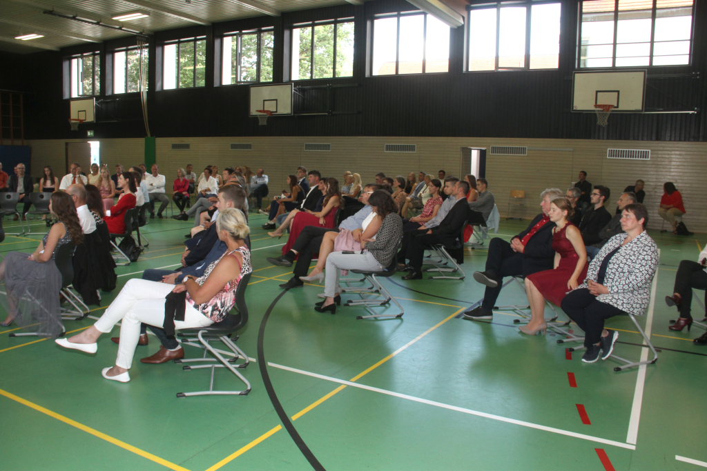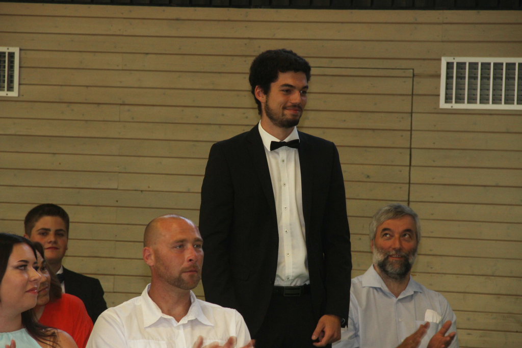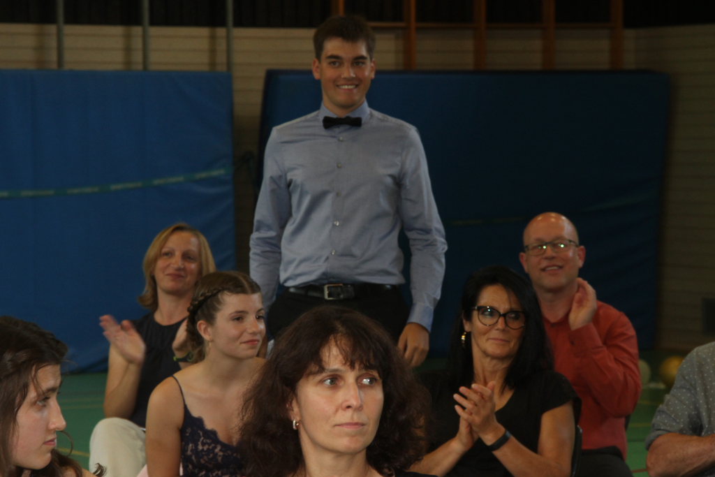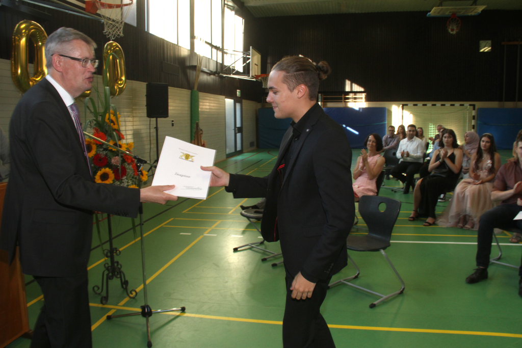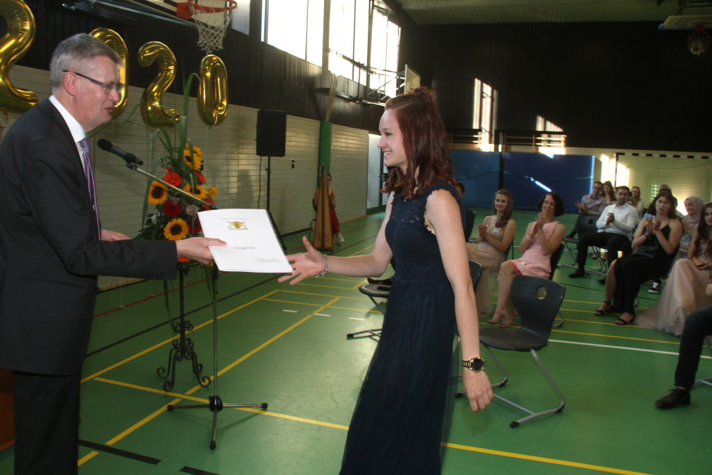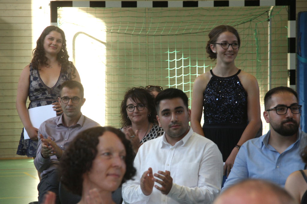 Als Vertreter der Abiturienten sprachen Alexa Gragnato, David Kling und Lukas Bettrich auf den drei Feierstunden. Gragnato ging acht Jahre zurück, als man sich ebenfalls in der Turnhalle bei der Einschulungsfeier zum ersten mal traf. Das Gefühl sei in etwa dasselbe geblieben: Die Freude es geschafft zu haben, die Angst vor neuen Herausforderungen, die Motivation neue Dinge zu lernen, Neues zu erfahren, die Zuversicht sich durch alle Schwierigkeiten irgendwie durchzuboxen. „Aber behaltet immer im Hinterkopf; wir haben den Matheunterricht überstanden, also können wir verdammt nochmal alles Überstehen.“ Hier hätten die meisten Freunde, vielleicht sogar die besten Freunde gefunden. „Diese Schule hat uns zusammengeschweißt, anders kann ich es nicht ausdrücken.“ Vor nicht allzu langer Zeit seien die Wunschberufe Prinzessin, Cowboy oder Pirat gewesen, jetzt wurde plötzlich von einem erwartet, sich für echte Berufe zu entscheiden und seine Stärken zu finden.