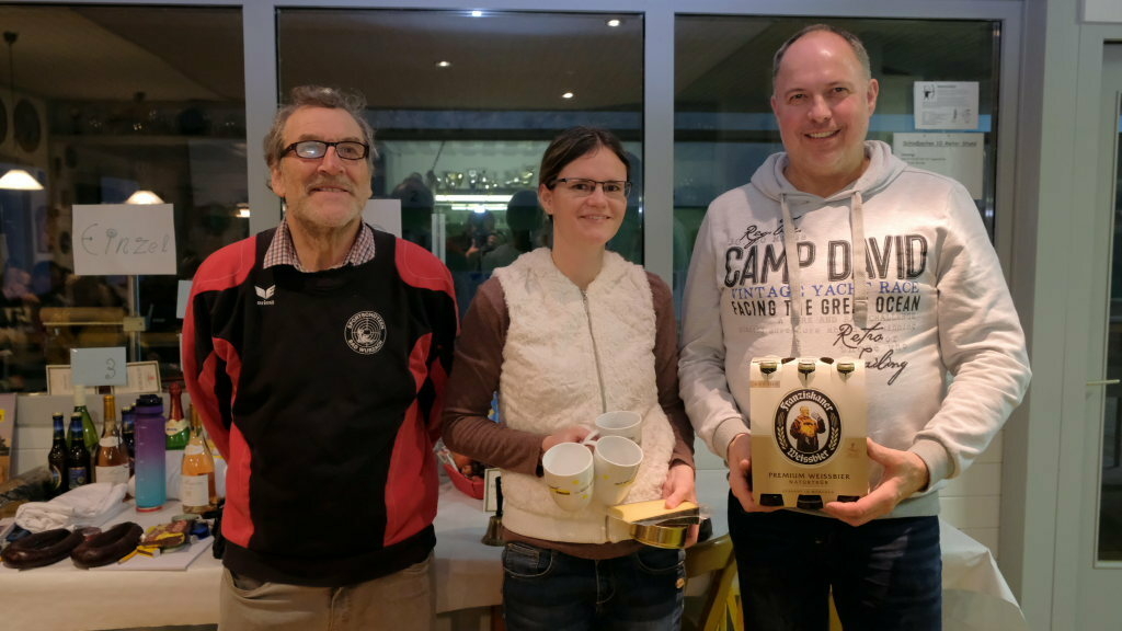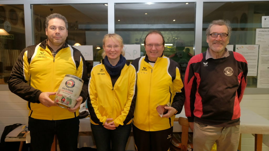 Die Mannschaftswertung bei der Luftpistole ging knapp an die Mannschaft TSG 1, Mit 3531,4 Punkten lagen Andre Loritz, Arthur Häusle und Oskar Laub nur dank der besseren Blatt´l um 338,4 Punkte vor Isny mit Alexandra Böck, Herbert Heumos und Manfred Veser. Auch im Kampf um Platz drei wurde es richtig knapp: Letztlich schafften es Edwin Lauber, Tobias Müller und Heike Sauter (TSG 2) dank einer konstanteren Leistung in der Blatt´l-Wertung mit gerade einmal 177,2 Punkten Vorsprung die Oberhand gegen Haidgau mit Torsten Harr, Michael Cosmici und Ulrich Gresser zu behalten.