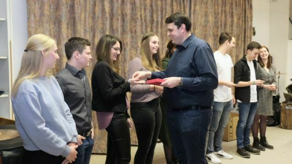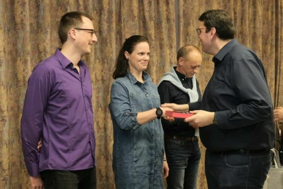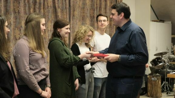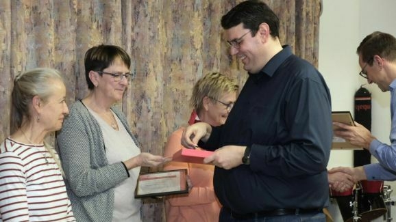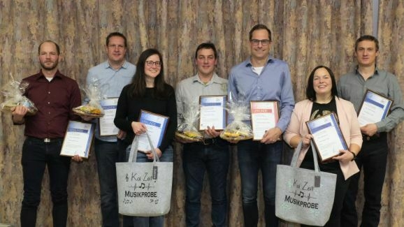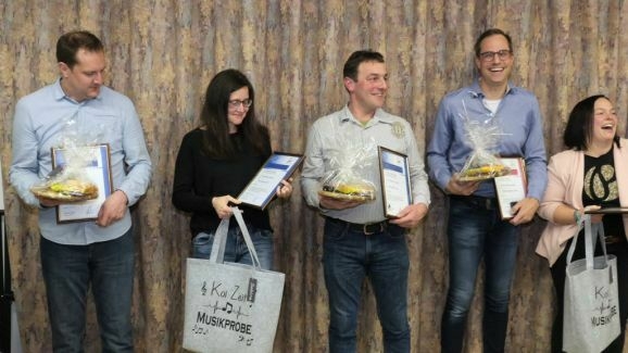 Auf 80 Jahre zusammen kamen Markus Gindele, seit 2011 stellvertretender Vorstand des des Fördervereines, Marjolein Grösser, die lange Zeit für die Homepage verantwortlich war, Sarah Minsch, die sich seit vier Jahren um die Chronik kümmert und Walter Strobel, der früher Schlagzeug spielte, ursprünglich in der MK Ziegelbach aktiv war und seit 2010 in der Stadtkapelle die Tuba bläst. Für ihre jeweils 20-jährige Tätigkeit erhielten sie die Ehrennadel in Silber.