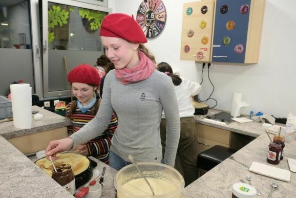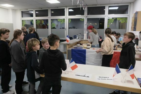 Rund um das Café Real war für die Verpflegung mit Kaffee und Kuchen, aber auch Deftigerem wie Quiche und Würstchen gesorgt. Der Fachbereich Französisch kam mit seiner Creperie sehr gut an, teilweise bildeten sich lange Besucherschlangen vor dem Ausgabe-Tresen dieser süßen Verführung.