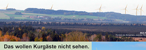 Dieser Faden wird im Innenteil aufgenommen mit dem warnenden Wort „Das wollen Kurgäste nicht sehen.“ Diese Zeile steht unter einem Riedpanorama, in das maßstabsgetreu sieben Windkraftanlagen einmontiert sind. Diese Großanlagen würden den Planungen zufolge zwar jenseits der Grabener Höhe in der Talaue bei Osterhofen stehen; da sie aber 260 Meter hoch sein sollen, würden sie den Höhenzug zwischen Ried und Osterhofen um 130 bis 180 Meter überragen. Es gebe Untersuchungen, sagen die Landschaftsschützer, wonach sich das Kleinklima im Bereich der Windkraftanlagen verändere; es werde wärmer und trockener, was für das Ried unabsehbare Konsequenzen haben könne.