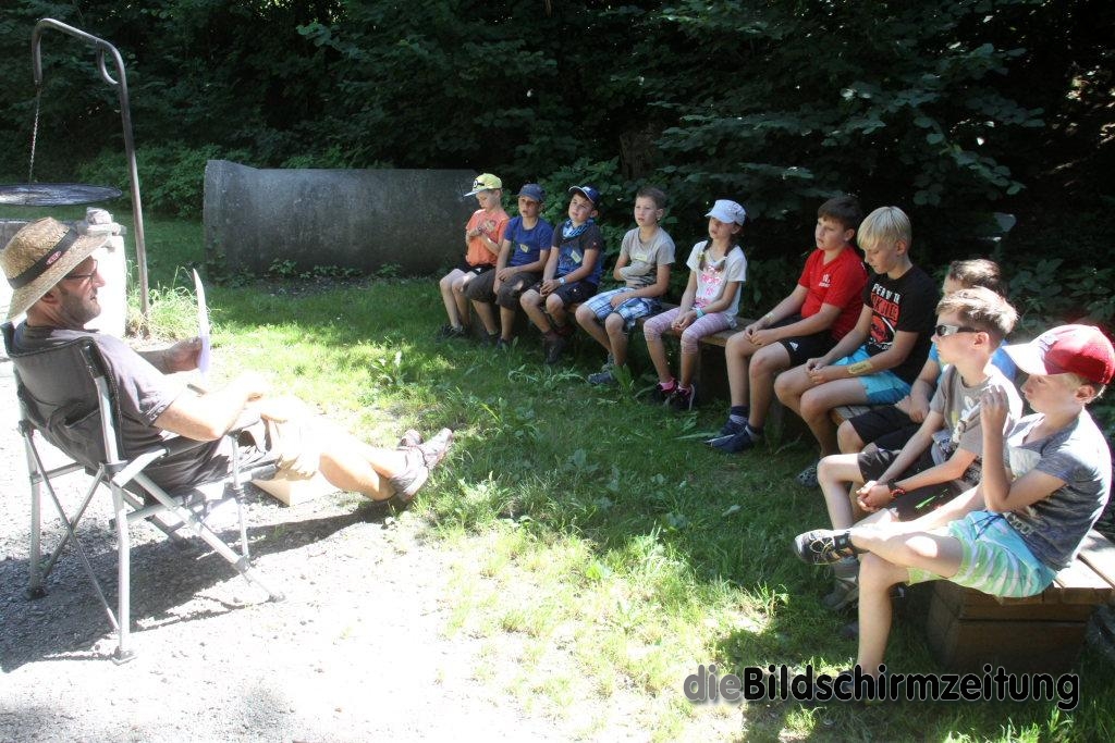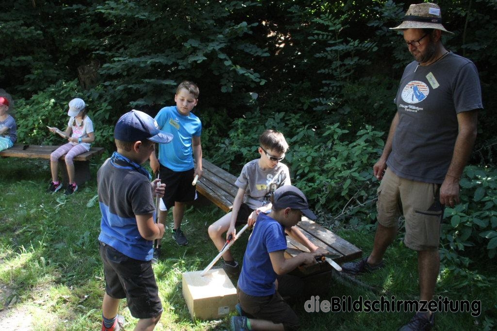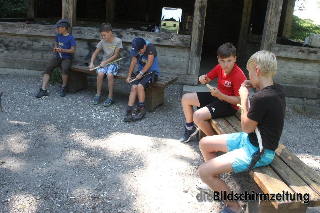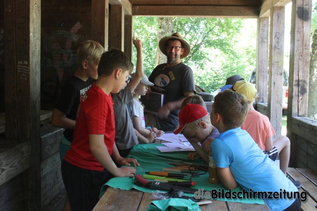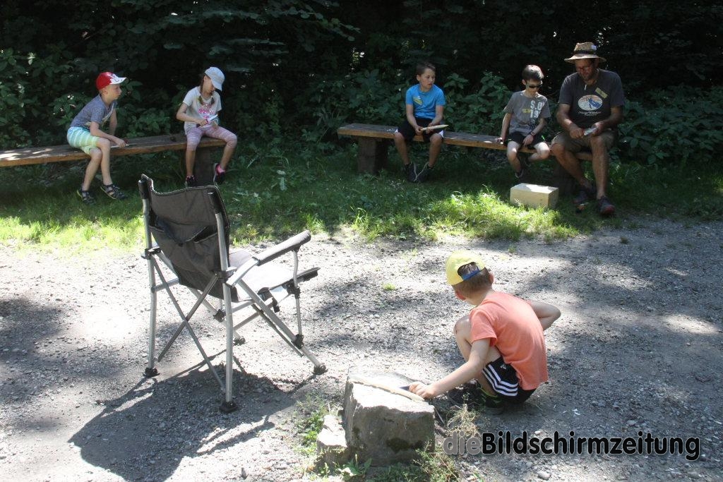 Im Rahmen des Kinderferienprogrammes bietet er in diesem Jahr während der Sommerferien mehrere ganz unterschiedliche Camps an. Los ging es am vergangenen Donnerstag für die Kinder mit dem Schnitz- und Messerführerschein beim Freizeitplatz Schurhütte. Unter seiner fachkundigen Anleitung förderten die Kinder von 8-12 Jahren bei Spielen zum Auftakt mit verschiedenen Spielen den Tast- und Orientierungssinn. Anschließend führte er sie in die Geschichte von Schneidwerkzeugen und Messern, von der Steinzeit bis zu den heutigen Spezialmessern ein. Über die neun Regeln beim Schnitzen lernten die neun Jungs und ein Mädchen wie der Umgang mit den scharfen Werkzeugen für sie selbst und die anderen gefahrlos möglich ist. Regel Nummer eins lautet dabei: immer von sich wegschnitzen. Eine weitere Regel lautet: Wer schnitzt der sitzt oder eine weitere: Unbenutztes Werkzeug einklappen, damit es für niemand eine Gefahr darstellt.