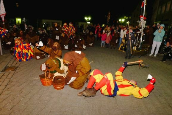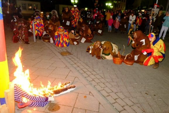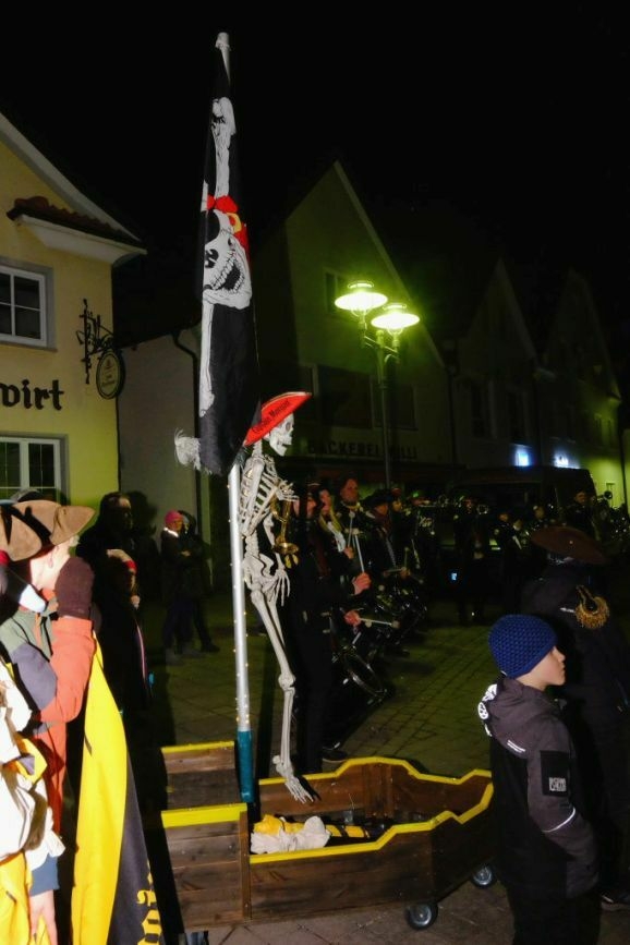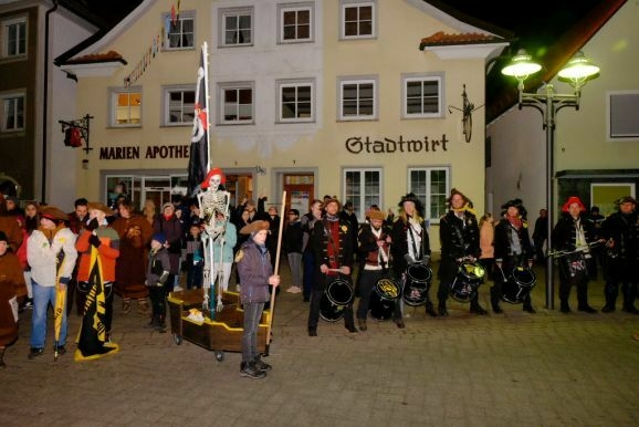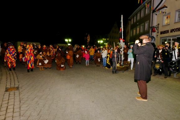 Es war ein richtig großer närrischer Trauerzug, der sich am Fasnetzeischdigobed unter den guggenmusik-ähnlichen Klängen des Fanfarenzuges dem Narrenbaum näherte, dort wo die Fasnet in Form der Strohpuppe Katharina ihr irdisches Dasein als ein Häufchen Asche beenden sollte.