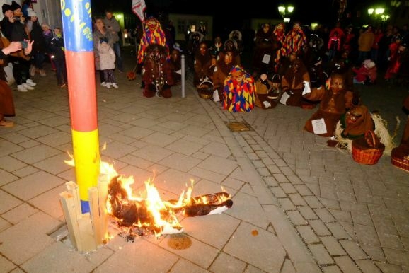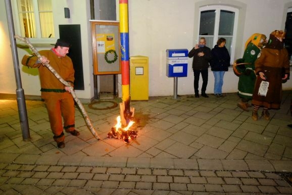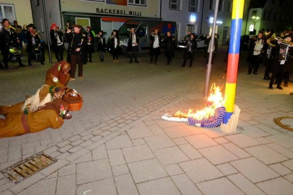 „Nur wer weiß, wie man Feuer macht, weiß es auch zu löschen“, dies ist die erste Lektion, die ein Feuerwehrmann in seiner Ausbildung lernt. Deswegen war es kein Geringerer als der Chef der Bad Wurzacher Jugendfeuerwehr, Pascal Schmehl, der Katharina in Flammen setzte. Und später, als die Feuerzungen auch an den Keilen des Narrenbaumes leckten, diese wie auch den glimmenden Aschehaufen der Fasnet, auch wieder löschte.