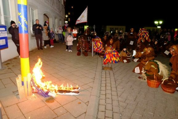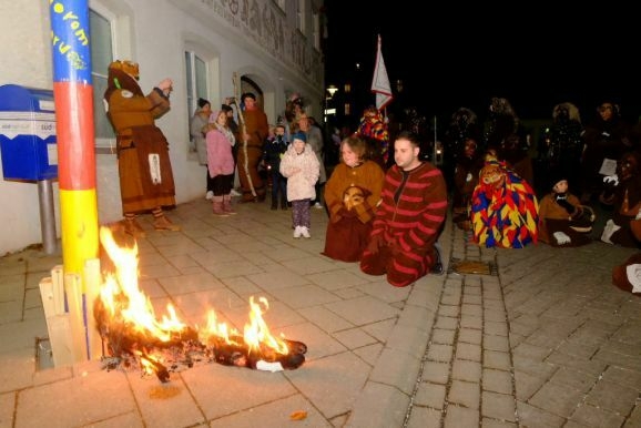 Zunftmeister Dominic Neher stimmte im Muetes-Häs (zu Ehren des in dieser Fasnetszeit verstorbenen Maskenschnitzers Michael Späth, Schöpfers dieser Maske) die Narrenschar und Gäste mit einem in Reimform gehaltenen närrischen „Gebet“ auf die „Einäscherung“ der Fasnet ein.