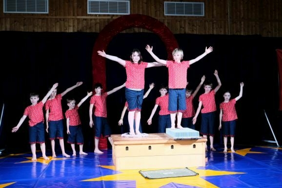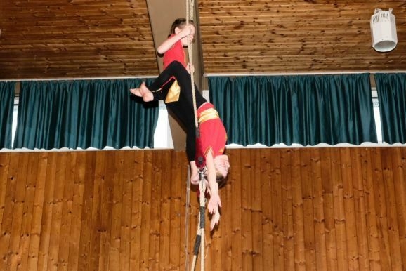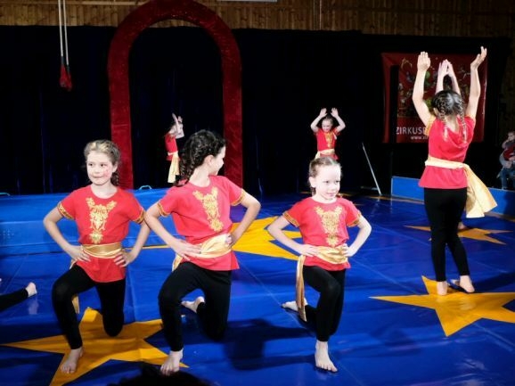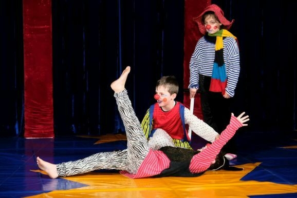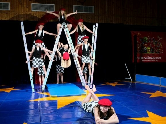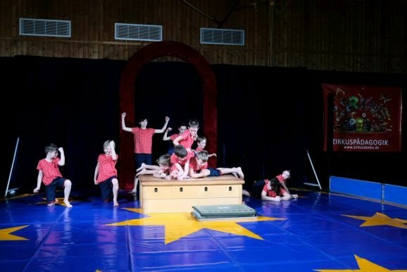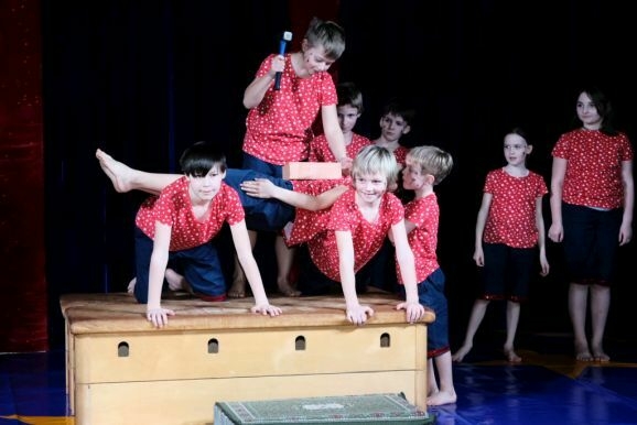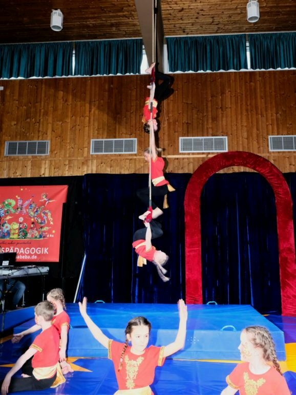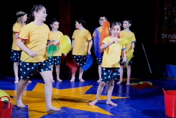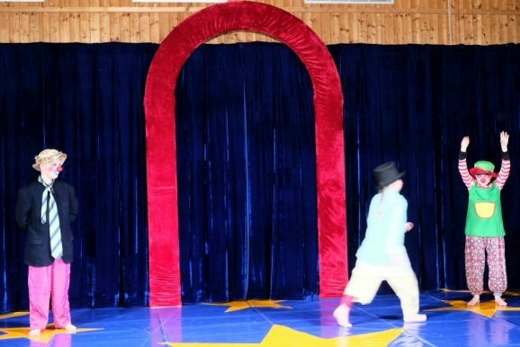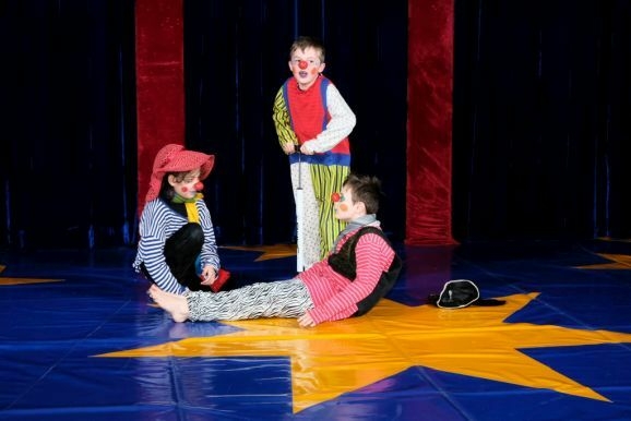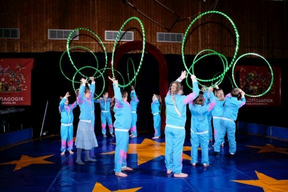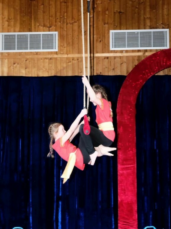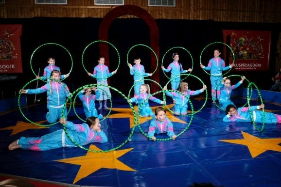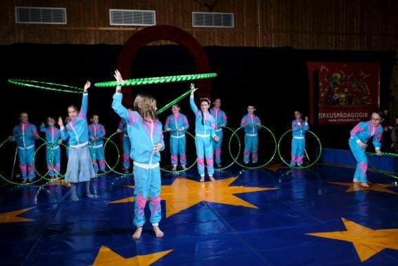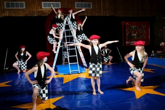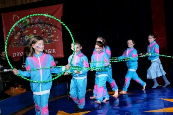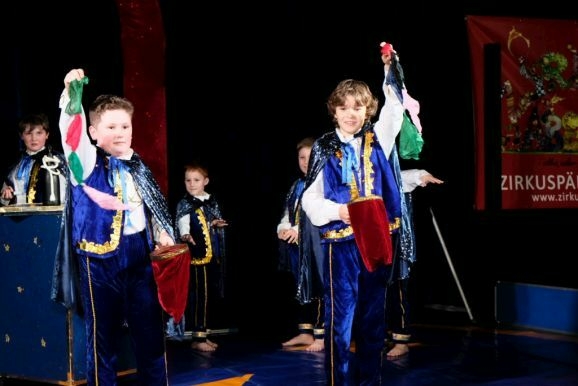 Mit einem Lied begrüßten die Kinder Eltern, Geschwister, Großeltern und Freunde rund um die Manege, ehe die wilde Meute von Clowns, Jonglierern, Zauberern und Akrobaten die Zuschauer richtige Zirkusluft schnuppern ließen. Ob mit Hula Hoop, mit Leitern oder am Trapez, ob mit verblüffenden Zaubertricks oder Zwerchfell angreifende Clownereien, die Kinder waren mit Feuereifer dabei machten die beiden Vorstellungen zu einem unvergesslichen Erlebnis.