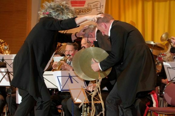Beim Auftritt der Chaos-Musik-Comedy-Truppe war von Altersmüdigkeit nicht das geringste zu spüren: Ihre Gags zündeten wie gewohnt und oft hinterließen sie ein „Trümmerfeld“. So etwa mit der zerstörten großen Trommel, die sie einfach in ihre Bestandteile auflösen ließen. Dass die alten Herren sich gelegentlich wegen musikalischen Differenzen buchstäblich „in die Haare bekamen“ gehörte ebenso zur Show wie das Alphorn-Solo, das in diesem Jahr erstmals von einem die Fahne mit dem Schweizer Kreuz schwingenden, Pfeife rauchenden Almöhi begleitet wurde. Apropos Rauch: Davon gab es reichlich bei diversen Knalleffekten, die zum Teil ganz schön das Trommelfell des Publikums (und der Mitmusiker) malträtierten.