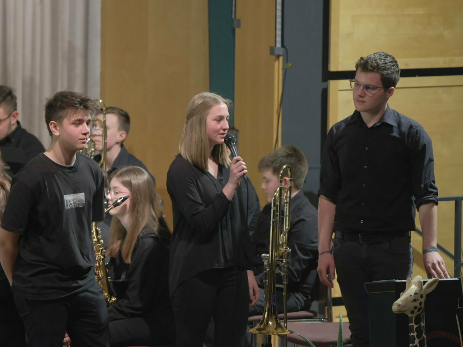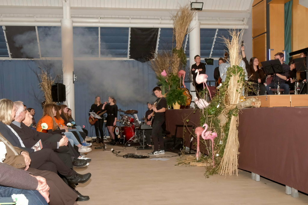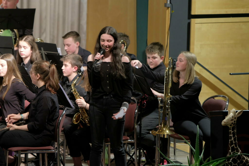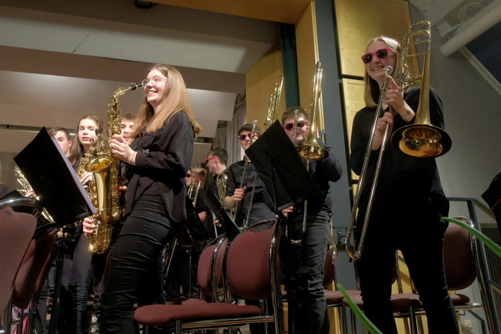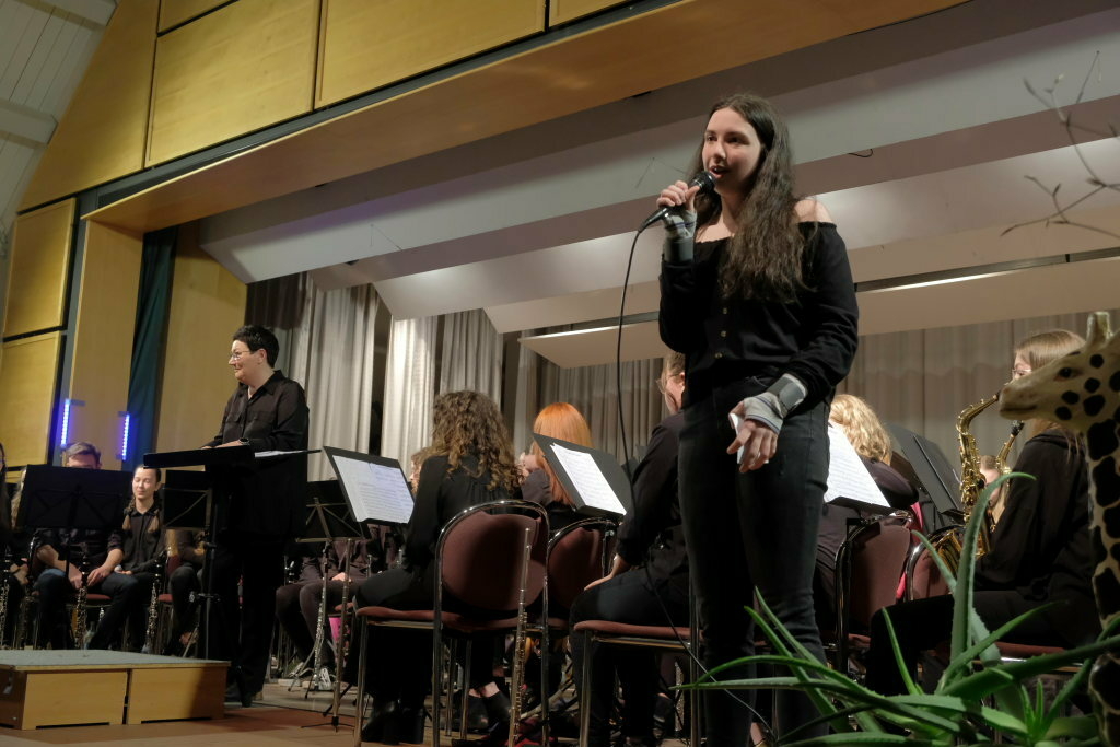 Danach wurde es wieder ruhiger als Pia Schmid mit ihrem Saxophon ein ein wunderbare Soloimprovisation auf die Bühne brachte. Mit „Trashing the Camp“ brachten die jungen Musiker um die musikalische Leiterin Petra Springer einen weiteren Phil Collins Hit aus dem Tarzan Film auf die Bühne.