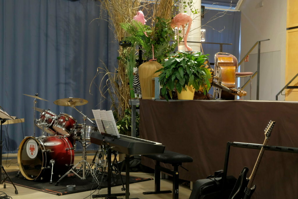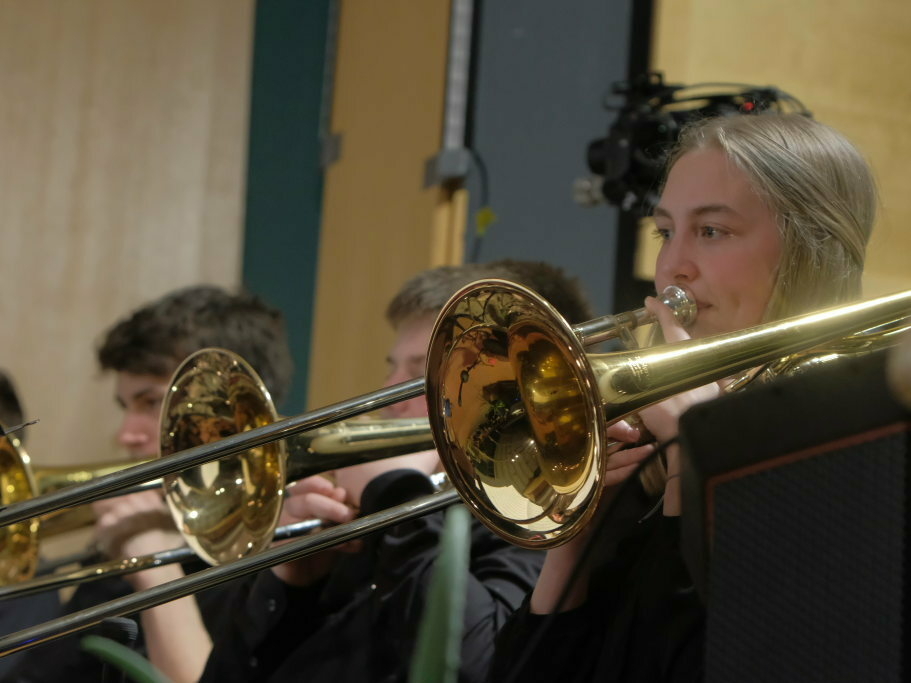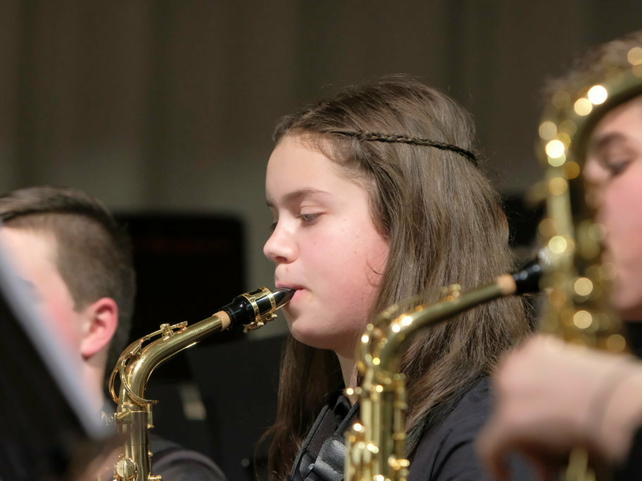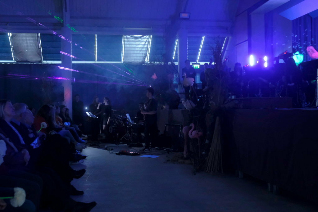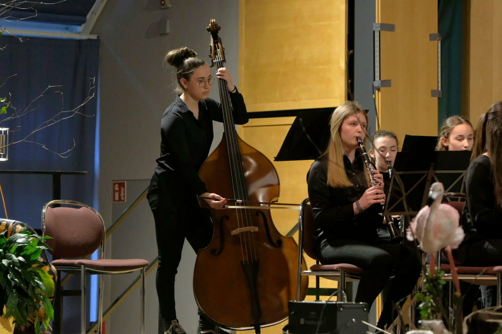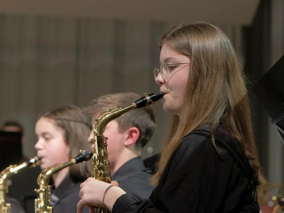 Danach wurde es wieder ruhiger als Pia Schmid mit ihrem Saxophon ein ein wunderbare Soloimprovisation auf die Bühne brachte. Mit „Trashing the Camp“ brachten die jungen Musiker um die musikalische Leiterin Petra Springer einen weiteren Phil Collins Hit aus dem Tarzan Film auf die Bühne.