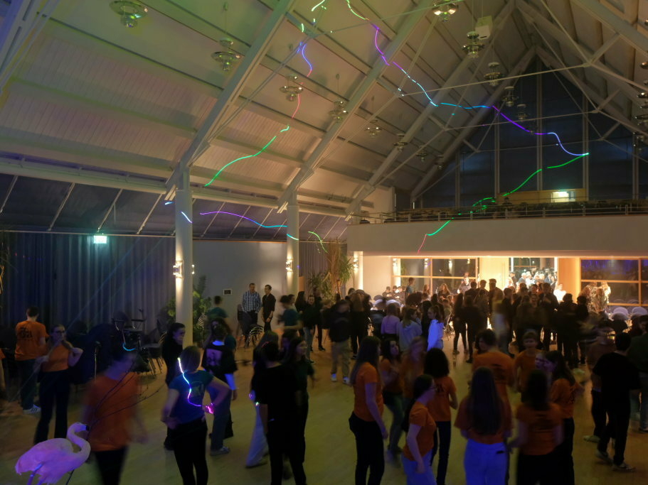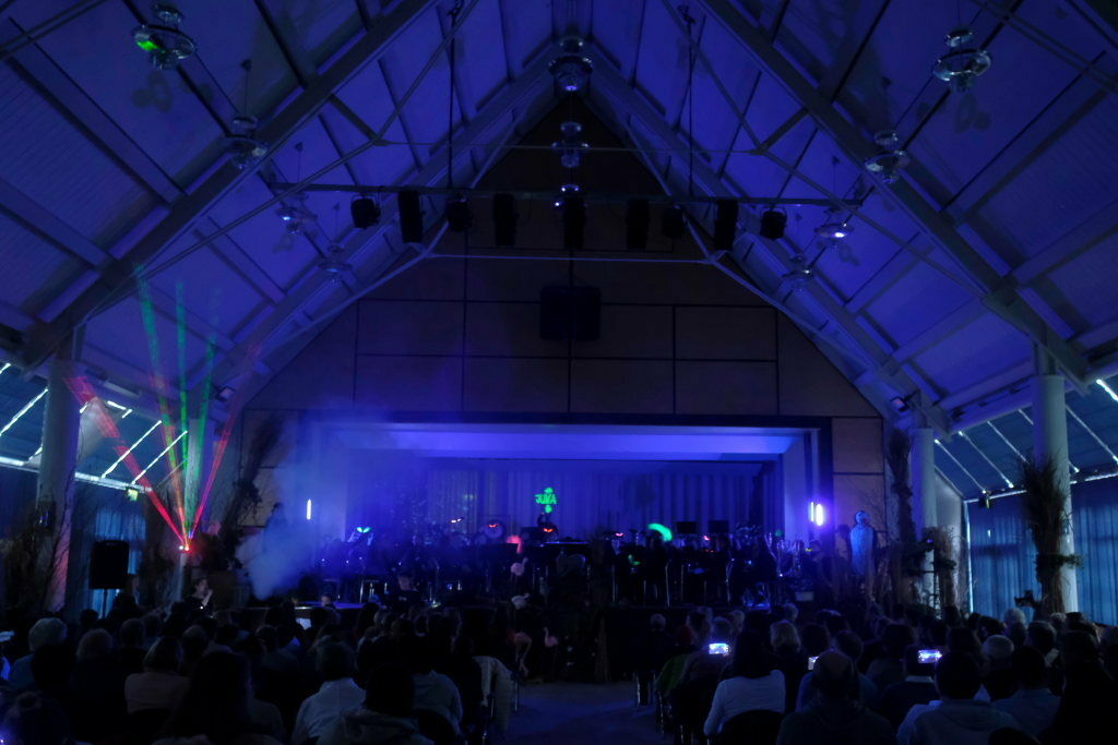 Eine richtiges Show Feuerwerk brannten die Mitglieder der Juka-Band Can´t stop bei dem Rock-Klassiker „Eye of the tiger“ von Survivor aus dem Jahre 1982 ab. Dabei leuchteten aus den Reihen des Orchesters mittels Schwarzlicht nicht nur ein Paar „Eye of the tiger“ sondern der abgedunkelte Kursaal wurde von einer wildzuckenden Lasershow beleuchtet.