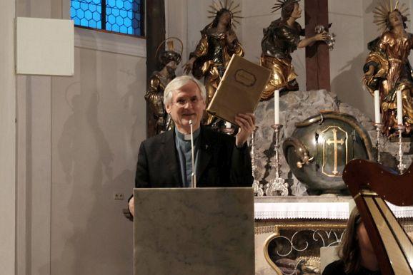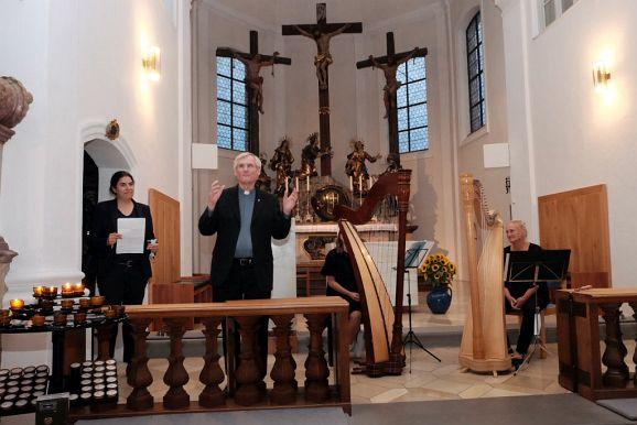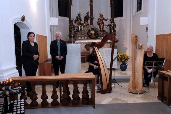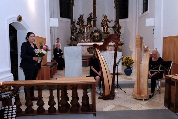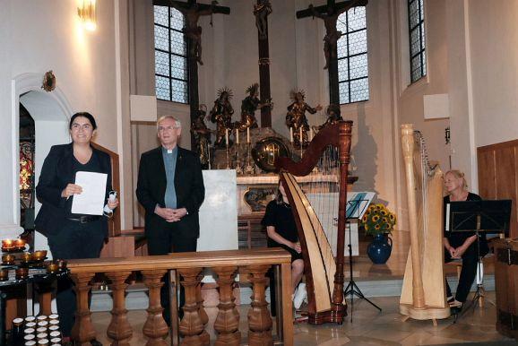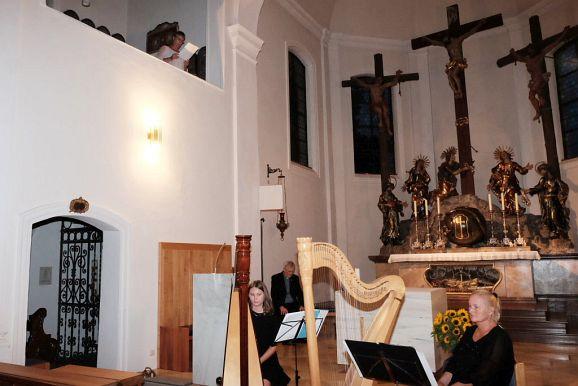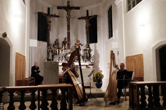 An diesem Abend brachte die renommierte Konzertharfenistin Ulrike Neubacher gemeinsam mit ihrer aus Seibranz stammenden Schülerin Luise Stampfer von ihr selbst arrangierte Barockstücke zur Aufführung. Die musikalische Eröffnung bestritt das Duo mit einem bekannten Kanon von Johann Pachelbel, ehe Johanne Gaipl, die Leiterin Der Bad Wurzach Info, die 35 den derzeit geltenden Hygienevorschriften gemäß vorangemeldeten Gäste begrüßte. Pater Superior Konrad Werder knüpfte in seinem zweiteiligen Vortrag über die Entstehung der Heiligkreuzkirche auf dem Gottesberg fast nahtlos an die letztjährige Barocknacht an, wo es damals um die im Schloss umher spukenden Geister unglücklicher Seelen gegangen war.