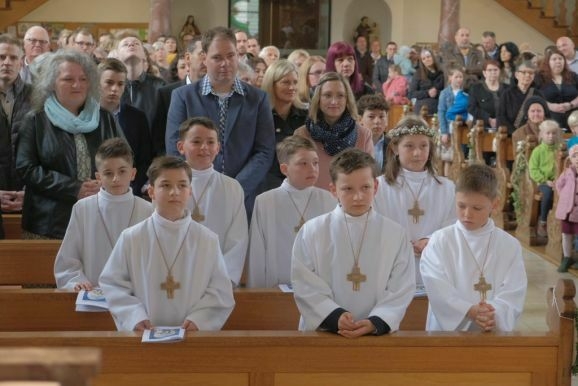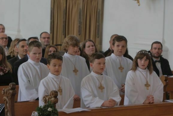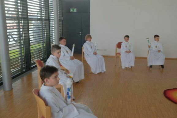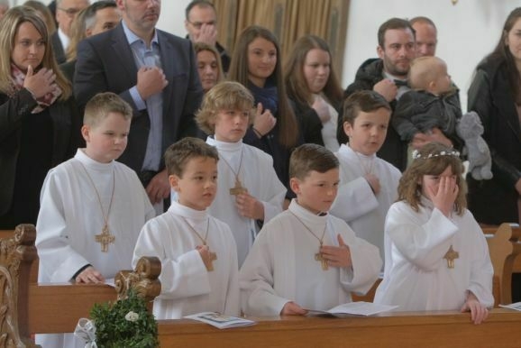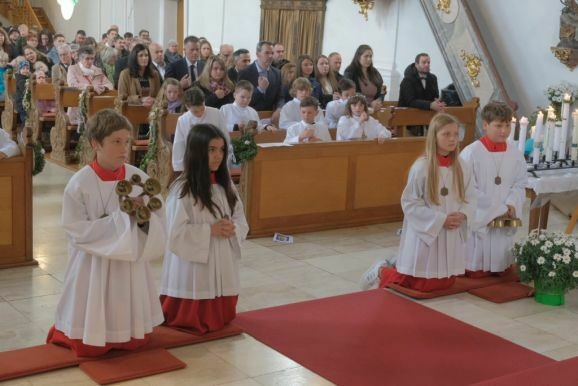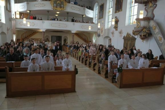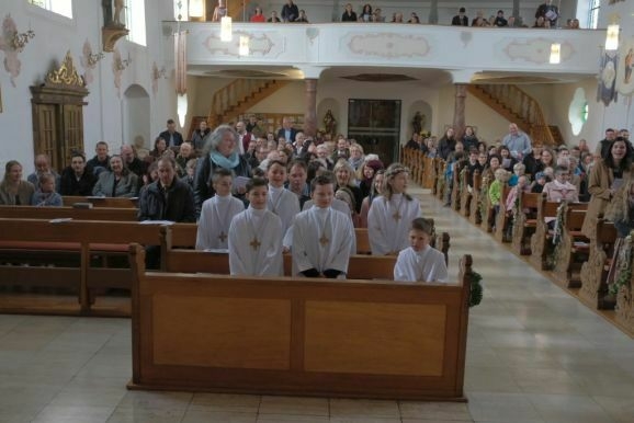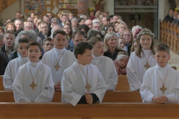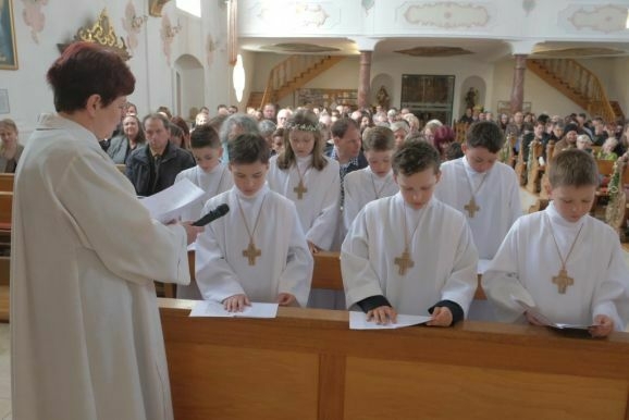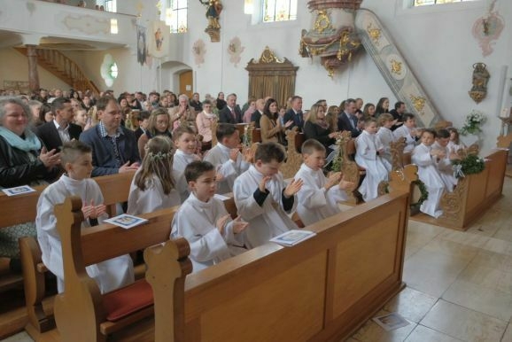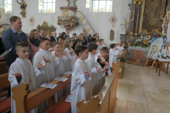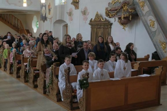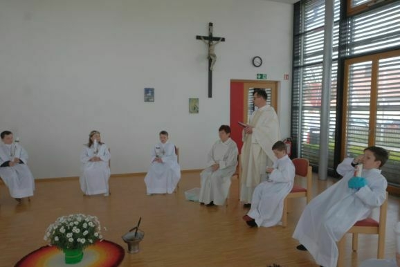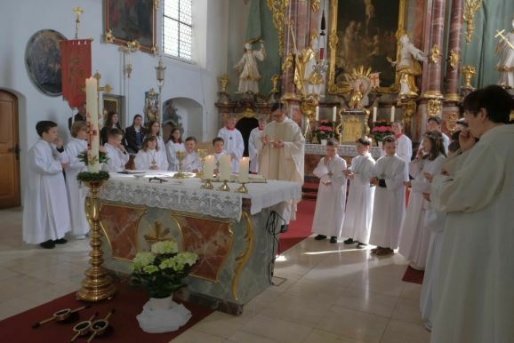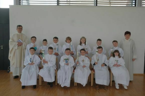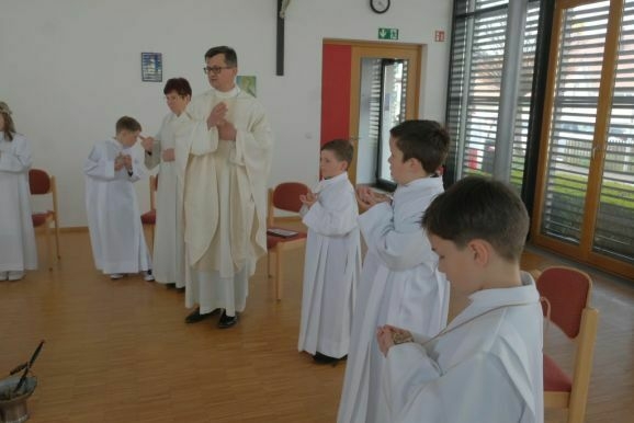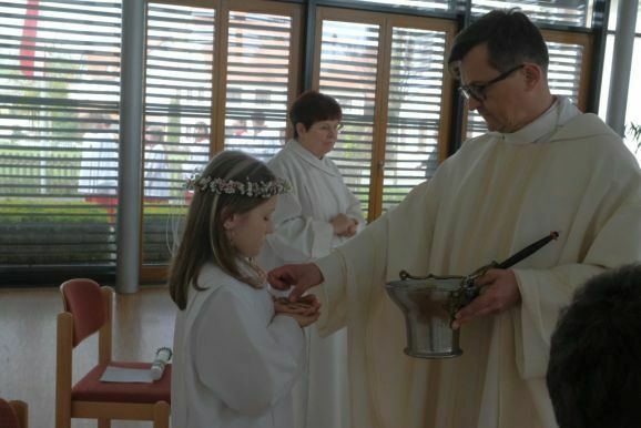 Pater Mariusz erklärte vor dem Glaubensbekenntnis, beim ersten Sakrament, das die Kinder empfangen hatten – bei ihrer Taufe – seien sie noch zu klein gewesen, damals hätten ihre Eltern für sie gesprochen. Mit der Erneuerung des Taufversprechens schufen die dreizehn Kinder nun die Voraussetzung, um zum ersten Mal an den Tisch des Herrn zu treten. Dazu versammelten sich die Kinder mit Pater Mariusz und Gemeindereferentin Angelika Schupp im Halbkreis um den Altar, wo sie nach der Gabenbereitung, Sanctus, Friedensgruß und Agnus Dei gemeinsam ihre erste Kommunion empfingen.