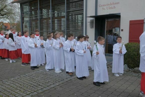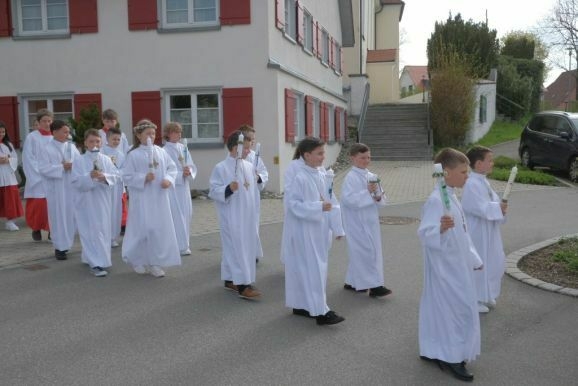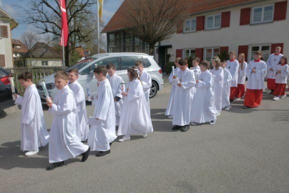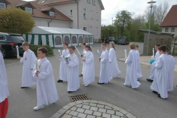 Nach Segen und „Großer Gott wir loben Dich“ geleitete die Musikkapelle die Kommunionkinder wieder zurück zum Gemeindehaus St. Ulrich, wo sich die Wege der Kommunionkinder bis zur Dankandacht am späten Nachmittag erst einmal trennten.