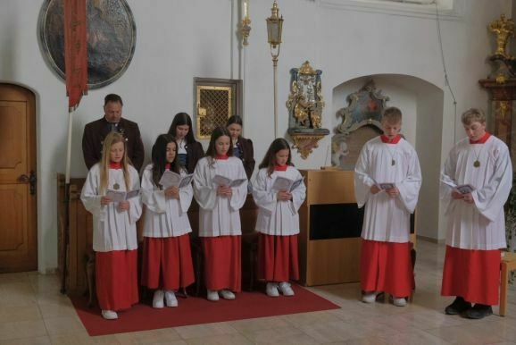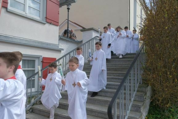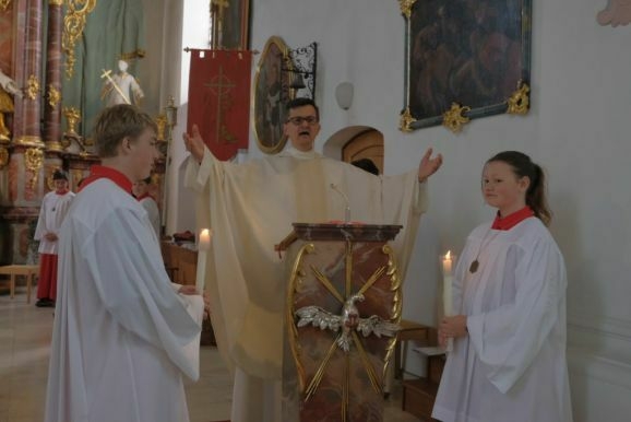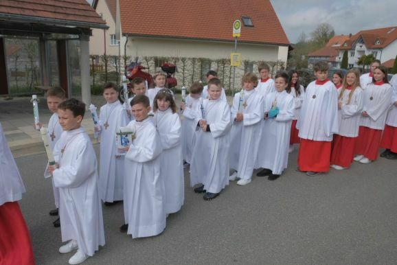 Die Musikkapelle Arnach geleitete die kleine Prozession mit Pater Mariusz, Gemeindereferentin Angelika Schupp, den Ministranten mit Vortragekreuz und Fahnen sowie den Hauptpersonen vom Gemeindehaus zur Kirche. Mit dem Lied „Unser Leben sei ein Fest“ begleitete die Gemeinde die Kinder zu ihrem Platz, nachdem im Eingangsbereich ihre Kerzen entzündet worden waren.