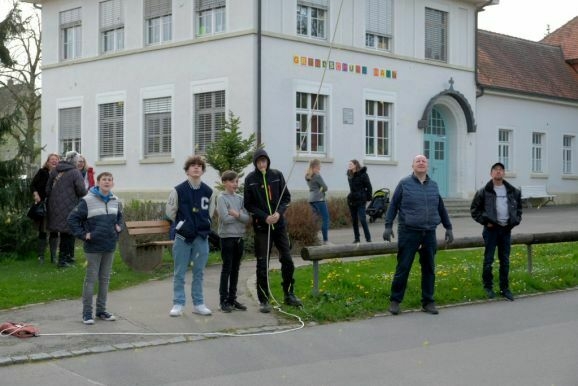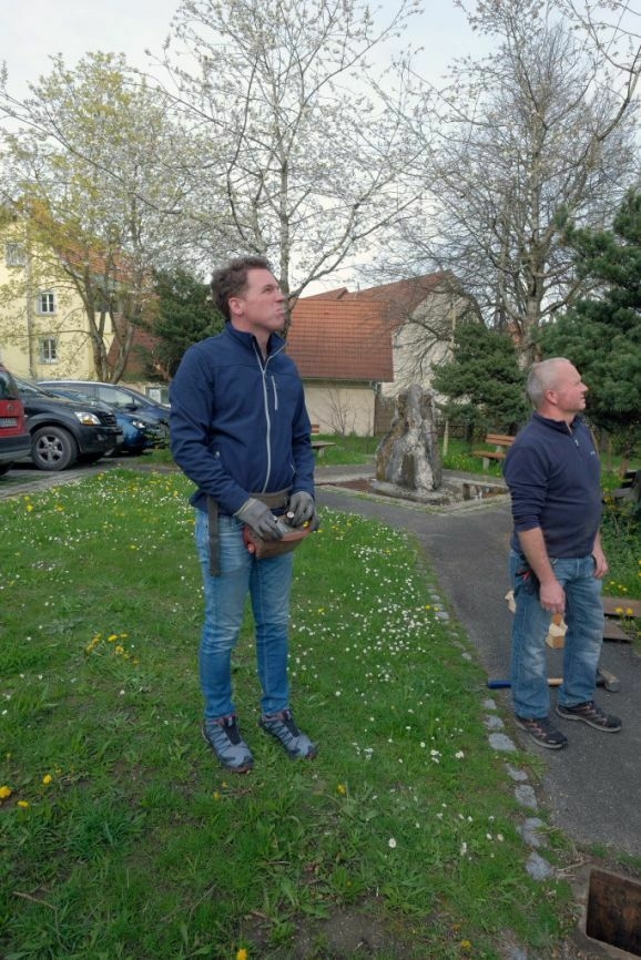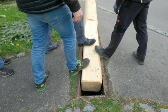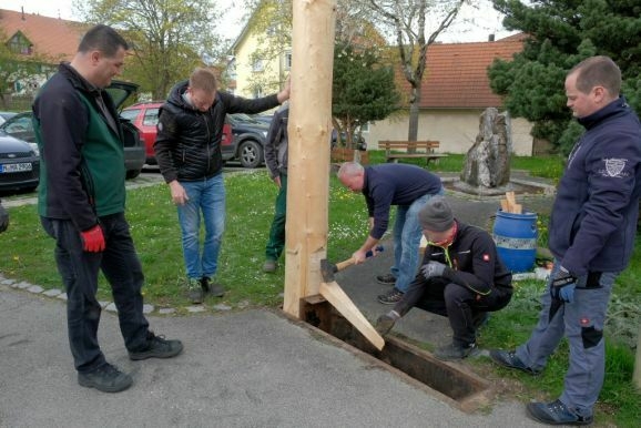 Mit einem Lkw-Kran und einer speziellen Hebebühne sowie mit viel Manpower wurde er an den vorgesehen Platz, einer schrägen Ebene nicht unähnlichen Eisenkonstruktion im Boden, gehievt. Bei der Vorbereitung des Baumes war der Sockel des Stammes schon auf das exakte Vierkantmaß zu gesägt worden. Nachdem der Baum durch Schieben des Hebekranes und Ziehen des Lkw-Kranes in die richtige Position gerutscht war, wofür von den beiden „Piloten“ viel Fingerspitzengefühl erforderlich war, wurde er mittels eines massiven Eisenschiebers und großen Holzkeilen gesichert. Es war ein Spektakel das sich auch der ehemalige Ortsvorsteher Alfred Wirth nicht entgehen ließ.