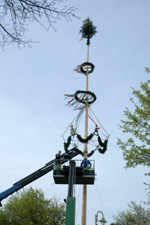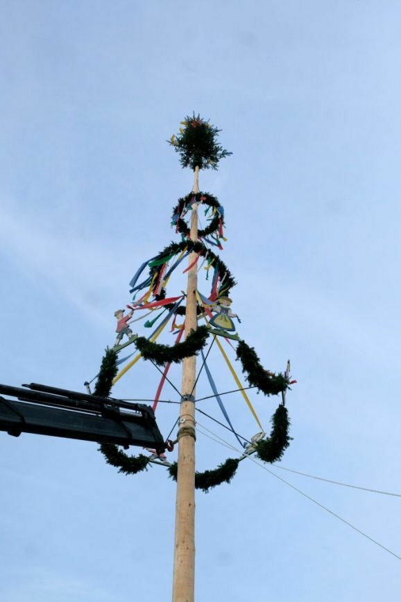 Der annähernd 30 Meter hohe Maibaum ist eine richtige Augenweide mit seinen beiden Reisigkränzen mit den wehenden Bändern. Etwas besonderes ist auch der große dritte Ring. Oder besser gesagt, das von den beiden tanzenden Paaren unterbrochene Sechseck.