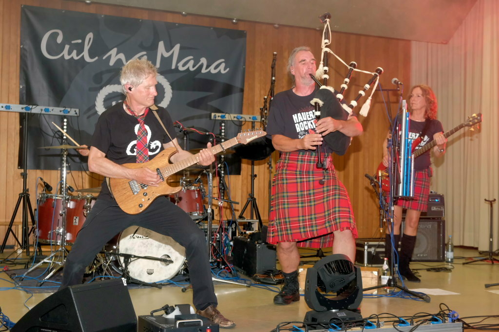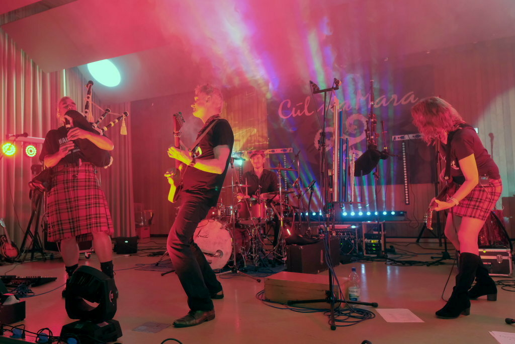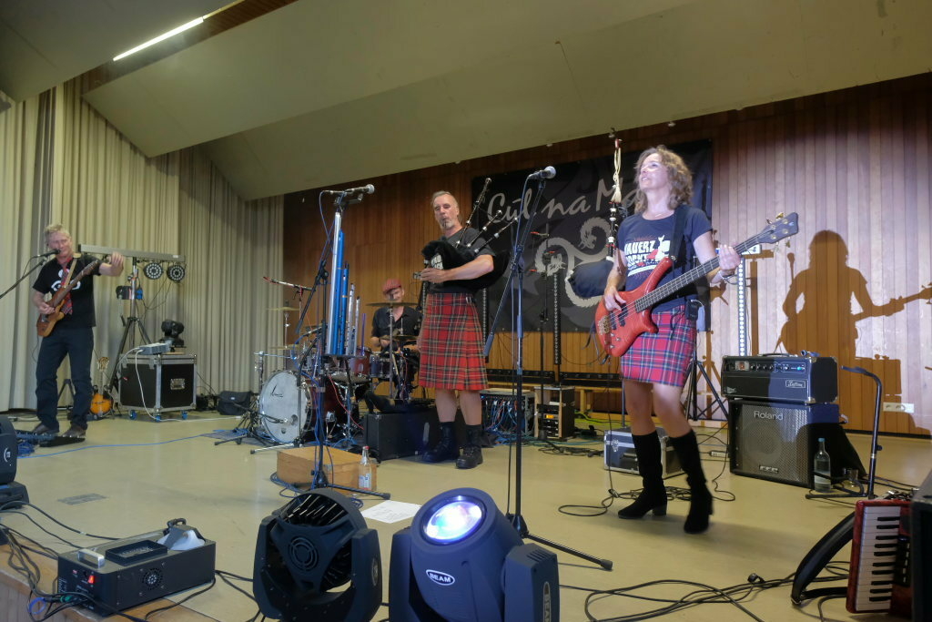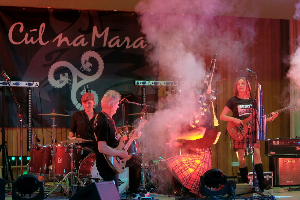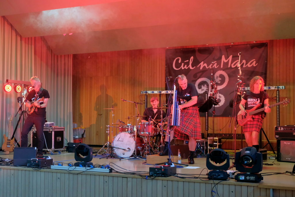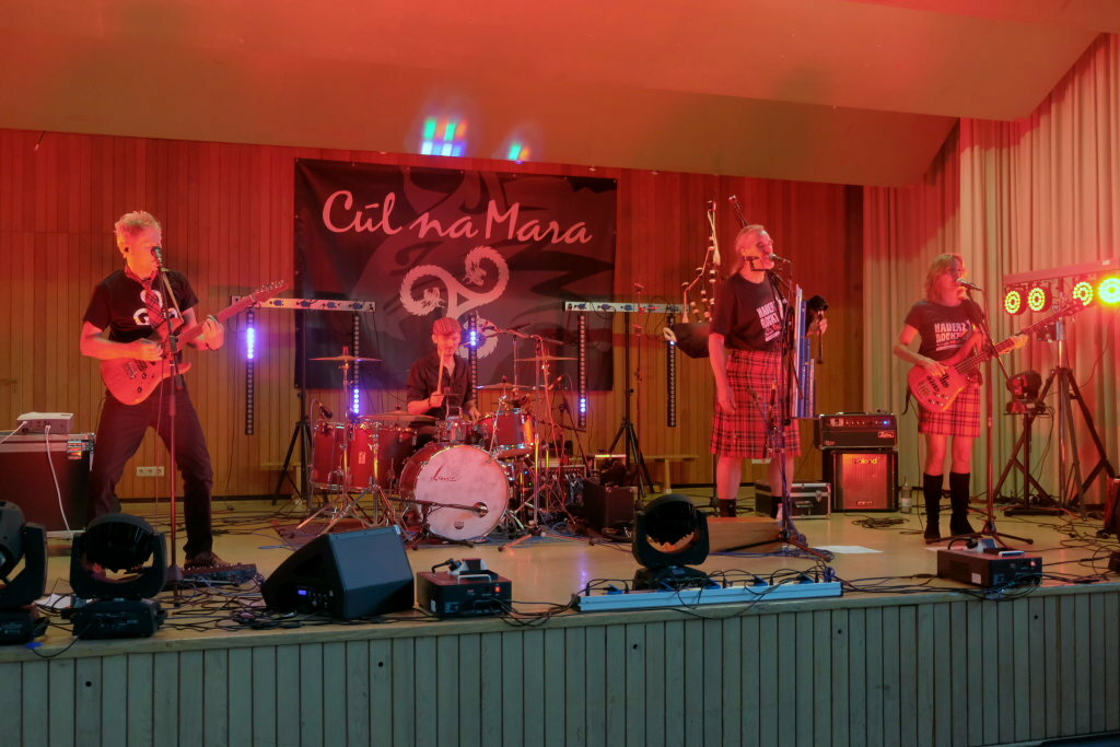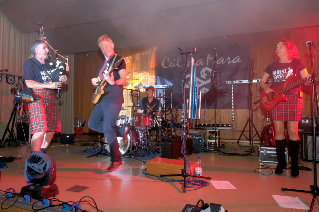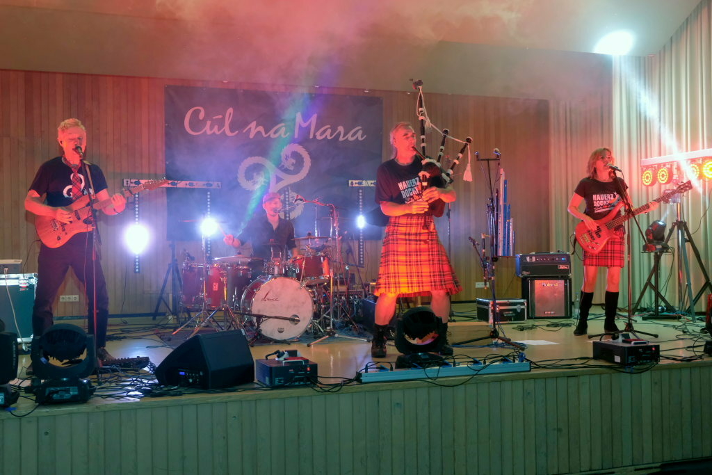 Cúl na Mara bespielt eine ungewöhnliche Bandbreite keltischer Musik. Ihr besonderer Reiz liegt dabei in der Kombination von traditionellen Instrumenten wie Highland-Pipe, Flöte, Akkordeon, Bouzouki und Mandoline mit der klassischen Rock-Besetzung aus Gitarre, E-Bass und Drums. Und dass die vier auch ein Faible für die australisch -schottischen Rock´n´ Roller von ACDC haben, deren Gründung sich in diesem Jahr zum 50ten mal jährt, zeigten sie mit mehreren Klassikern aus deren Repertoire. Darüberhinaus konnten die Konzertbesucher auch einiges über die irische Mentalität lernen, etwa bei „Whiskey or woman“ . Im Pub vor die Wahl gestellt – Whiskey oder eine Frau – ist für den irischen Mann sonnenklar für was er sich entscheidet. Oder dass es überall auf der Welt ein Irish Pub gibt: „Everywhere an Irish Pub“.