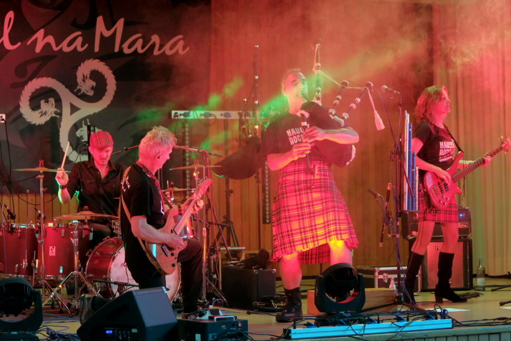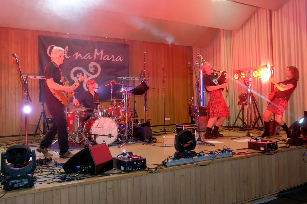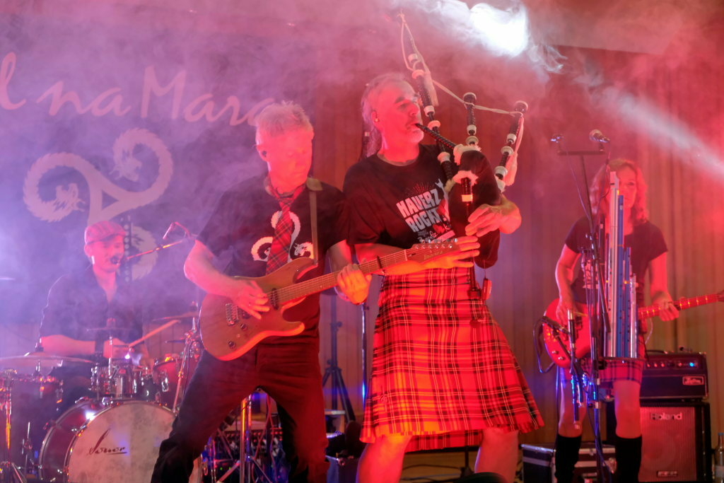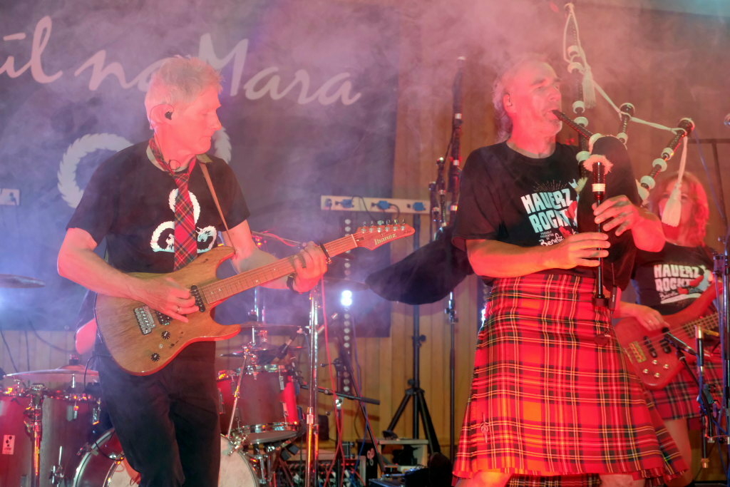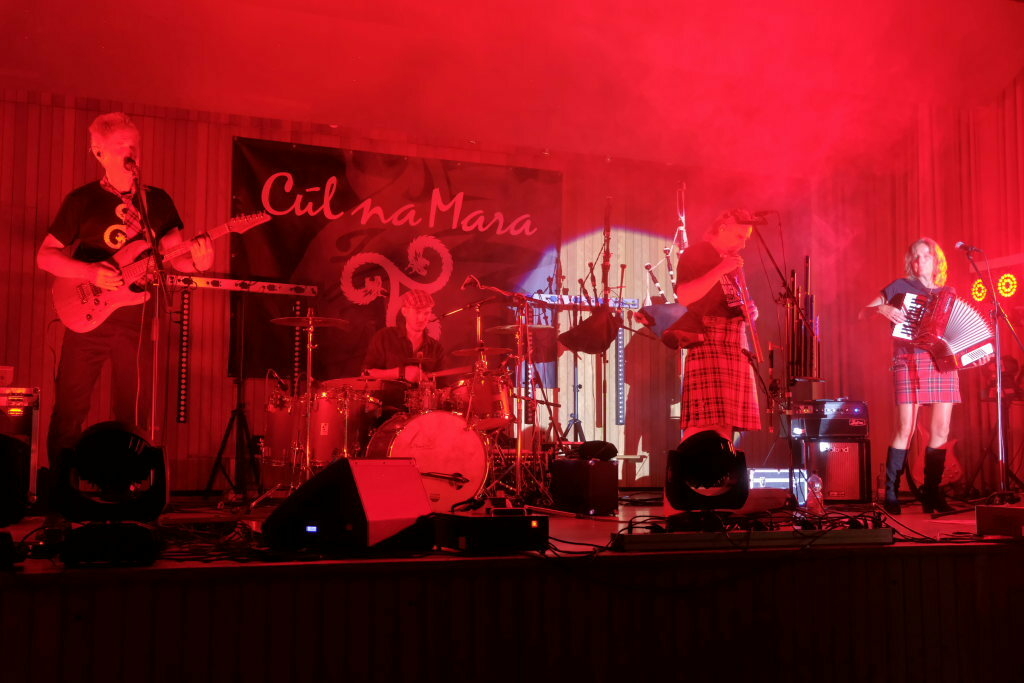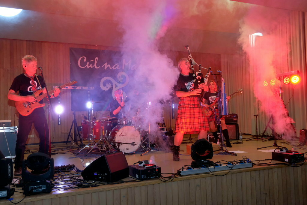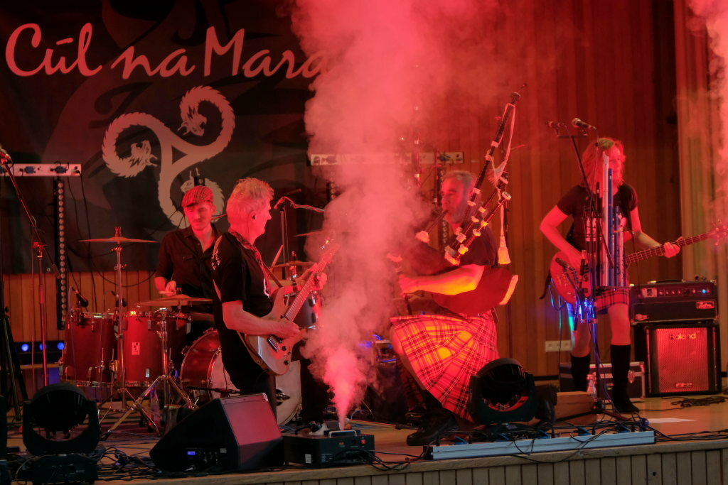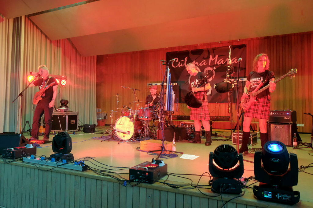 Cúl na Mara bespielt eine ungewöhnliche Bandbreite keltischer Musik. Ihr besonderer Reiz liegt dabei in der Kombination von traditionellen Instrumenten wie Highland-Pipe, Flöte, Akkordeon, Bouzouki und Mandoline mit der klassischen Rock-Besetzung aus Gitarre, E-Bass und Drums. Und dass die vier auch ein Faible für die australisch -schottischen Rock´n´ Roller von ACDC haben, deren Gründung sich in diesem Jahr zum 50ten mal jährt, zeigten sie mit mehreren Klassikern aus deren Repertoire. Darüberhinaus konnten die Konzertbesucher auch einiges über die irische Mentalität lernen, etwa bei „Whiskey or woman“ . Im Pub vor die Wahl gestellt – Whiskey oder eine Frau – ist für den irischen Mann sonnenklar für was er sich entscheidet. Oder dass es überall auf der Welt ein Irish Pub gibt: „Everywhere an Irish Pub“.