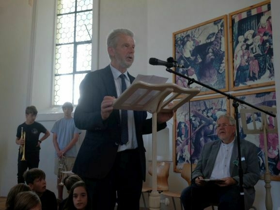 Sozialminister Lucha sprach über die Veranstaltung von großem Kino, weil neben Eiden auch noch zwei ehemalige Kulturamtsleiter des Landkreises im Leprosenhaus dabei waren. Für ihn gebe es kein „Kunschd oder Krombiera,“ stellte Lucha klar. Er sei dankbar, dass sein Ressort die Landesarmutskonferenz unterstützen könne. In diesem Zusammenhang dankte er der Dieter und Susanne Wolfram-Stiftung, deren Vorstand Prof. Dr. Thomas Knuppen später einen Vortrag über den Preisträger hielt : „Das Erbe Sepp Mahlers –Eine Zukunftsversion“. Denn dank der Wolfram-Stiftung sei eine kulturelle Vielfalt möglich. „Kultur ist Kraft für die Seele.“ Das Leben und Wirken Sepp Mahlers zeige ein durch und durch humanistisches Menschenbild.