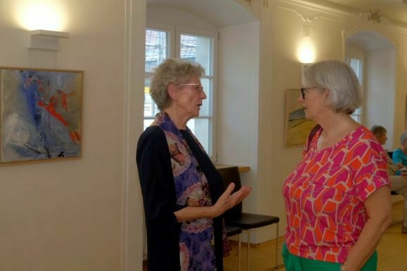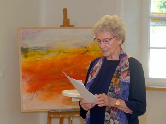 In ihre verbalen Ausführungen zu den verschiedenen Maltechniken mischte Hanne Schneider an diesem Abend auch geschickt ihre persönlichen und emotionalen Eindrücke. „Irgendwann wurde mir bewusst, dass ich mit Linien, die einem Bild Spannung und Halt geben, locker umgehen kann.“ Oder: „Ich will aber auch nicht verschweigen, dass ich ab und zu mit der Fläche „gekämpft“ habe, um das Gleichgewicht herzustellen.“