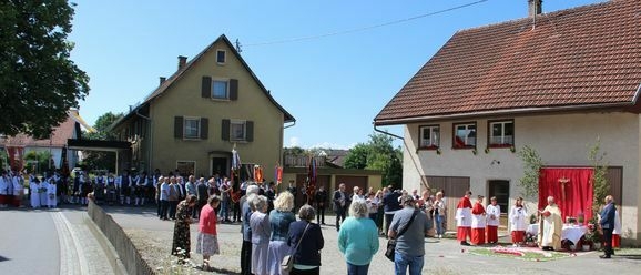 Begleitet wurde der Priester von den Fahnenabordnungen und den Gläubigen sowie neben der Musikkapelle unter Leitung von Berthold Hiemer auch vom Kirchenchor, der unter seinem Dirigenten Wolfgang Roth an den Altären seinen musikalischen Beitrag leistete. Dort spendete der Geistliche nach jeweils einer Lesung aus allen vier Evangelien den Segen, ehe die Gemeinde sich zum Abschluss-Segen noch einmal in der Kirche versammelte, wo sich Pater Josef bei allen Beteiligten bedankte. Nach dem an diesem hohen Festtag obligatorischen „Großer Gott, wir loben Dich“ verlagerte sich die Festgemeinde zum von der Soldaten- und Schützenkameradschaft ausgerichteten Gemeindefest beim Rathaus.