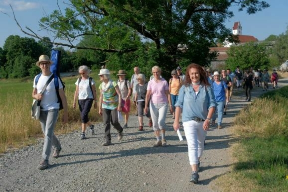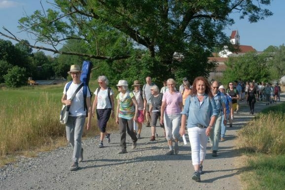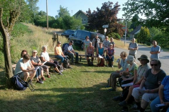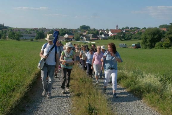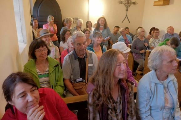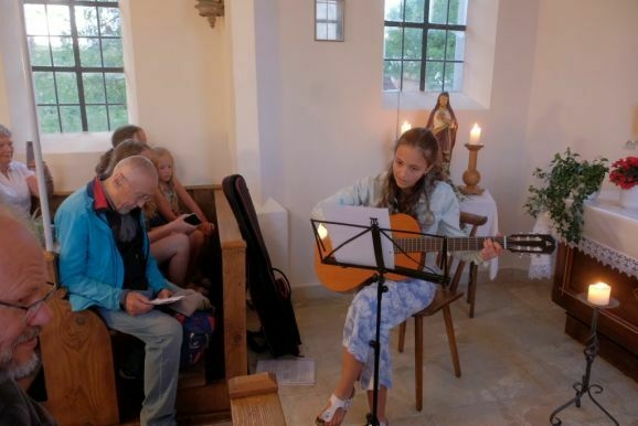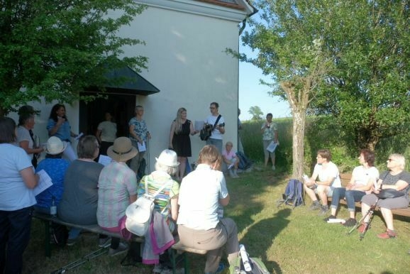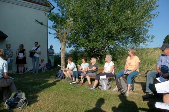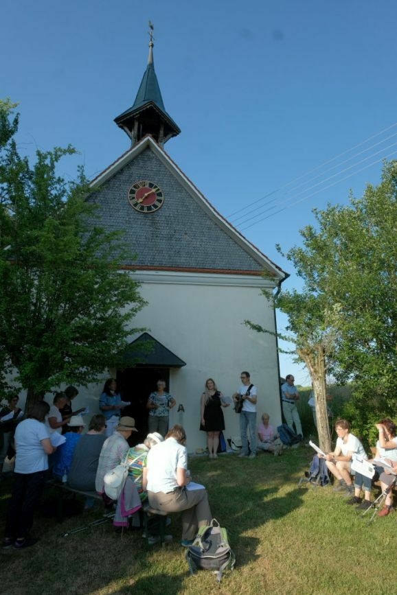 Und tatsächlich, die Wahrnehmung verändert sich innerhalb kürzester Zeit: Die Natureindrücke, etwa beim Sehen und riechen werden intensiver, gleichzeitig achtet man mehr auf den Mitwanderer. Nach einer kurzen Rast zum Sammeln im Schatten des ehemaligen Schiedel-Anwesens ging es hinauf in Richtung Starkenhofener Kapelle, wo die ersten musikalischen und geistlichen Impulse gesetzt wurden.