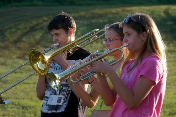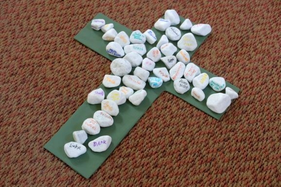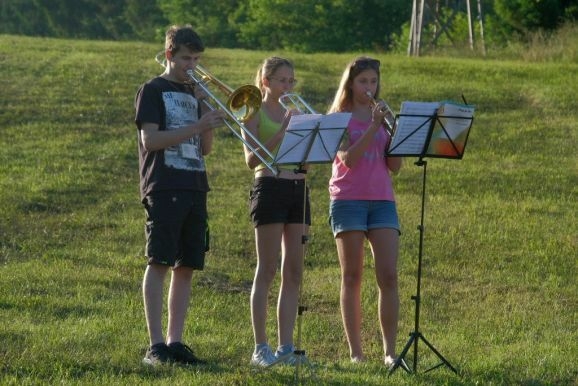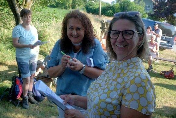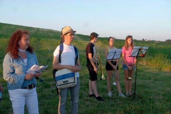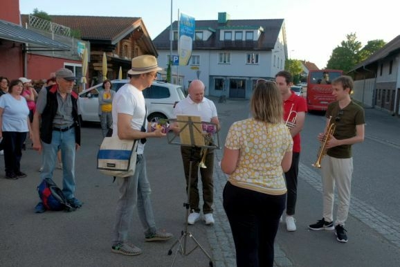 Gemeinsam mit Jeaninne Fleischer sang Raimund Miller das Lied „Turn, Turn,Turn“, Agnes Schad gab einen ersten geistigen Impuls und verteilte kleine Steine, auf die die Wanderer ihre gegenwärtigen Emotionen notierten und in der Kapelle auf einem dafür vorgesehenen Kreuzsymbol ablegten. Weiter ging es nach den gemeinsam gesungenen Liedern „Meine Zeit “ und „Ins Wasser fällt ein Stein“ weiter Richtung Butzenmühle, vorbei an einer Hochzeitsfeier, in das Auf und Ab des kühlen Waldes. Bei der letzten Steigung, bevor es wieder Richtung Gospoldshofen talwärts gehen sollte, gab Petra Greiner den Impuls zum Thema Achtsamkeit, nachdem drei junge Bläser die Gruppe musikalisch begrüßt hatte.