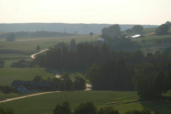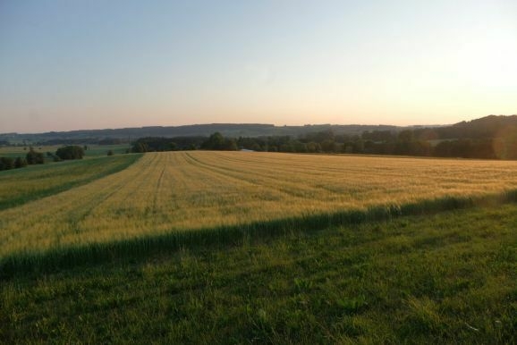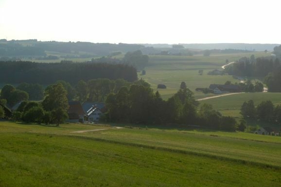 Nachdem Verlassen des Waldes bot sich den Pilgern ein wunderschöner Blick über die in ein weiches Abendlicht getauchte hügelige Voralpenlandschaft.