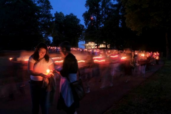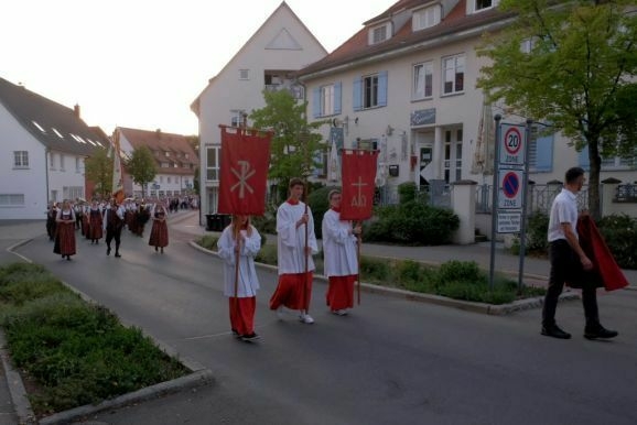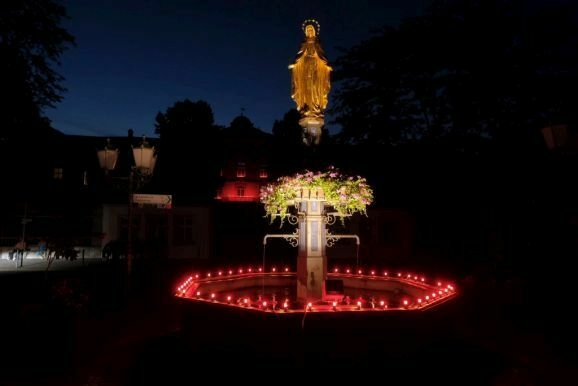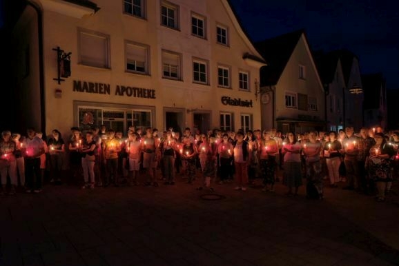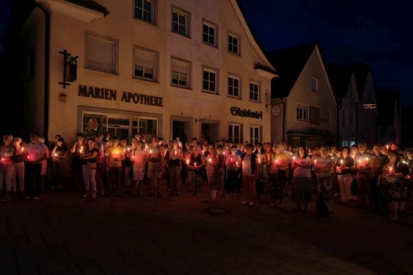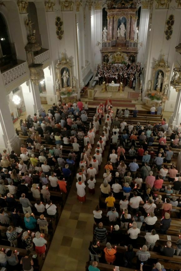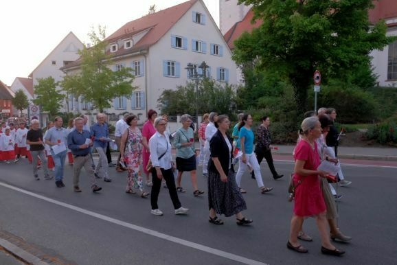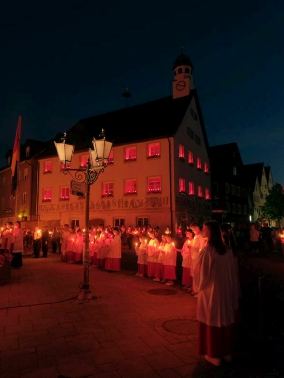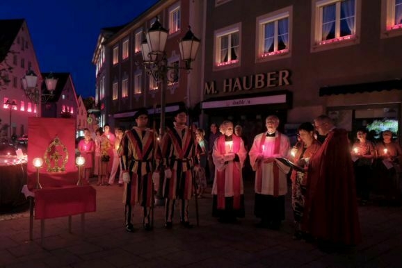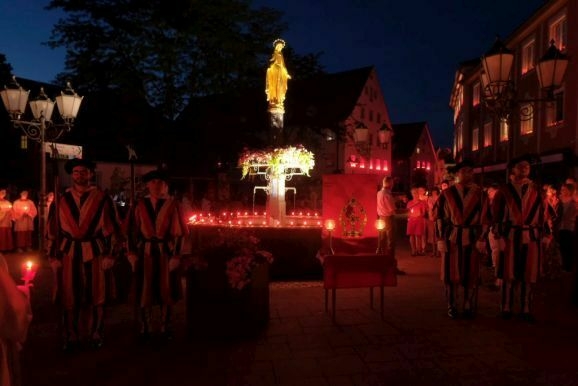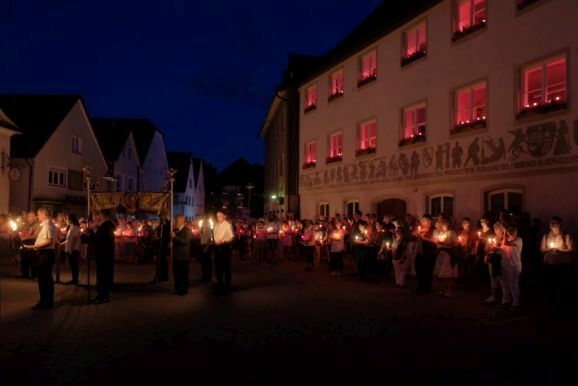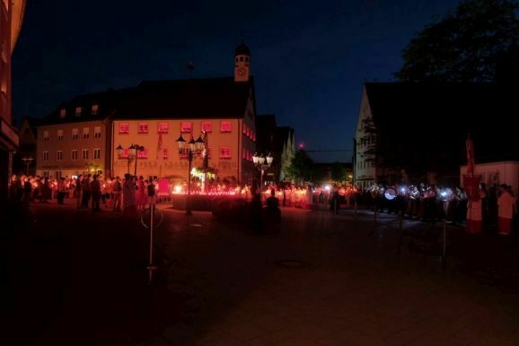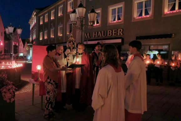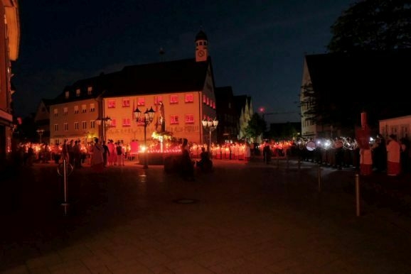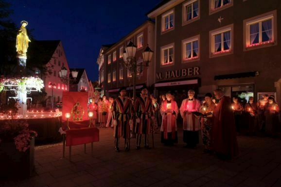 Nachdem Pfarrer Maier die Gläubigen zum ersten Mal an diesem Abend mit der Reliquienmonstranz gesegnet hatte und diese ihre Kerzen entzündet hatten, trug er die Reliquie in einer beeindruckend langen Prozession in die Stadt hinab. Am Marienbrunnen spendete Pfarrer Patrick Meschenmoser, der dann die Reliquie zurück in die St. Verenakirche trug, den Segen. Für einen kurzen Augenblick verwandelten die vielen Kerzenlichter beim Aufbruch der Prozession den Platz um den Brunnen in ein Lichtermeer.