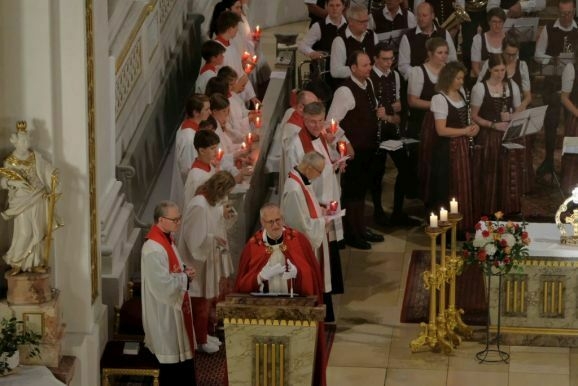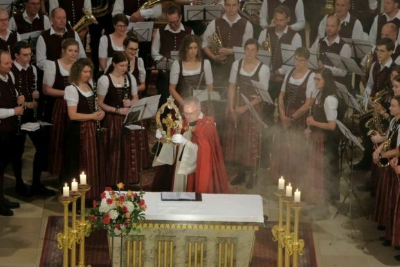 Und genau das tat Pfarrer Stefan Maier dann in seiner Ansprache: Er nahm die Gläubigen mit auf den Prozessionsweg, auf den Gottesdienst der Blutreiterinnen und Blutreiter auf dem Rücken der Pferde – in Bewegung. Denn kaum jemand außer Großem Handwerk und Fetter Zunft kennt das, was an den vier Stationsaltären erbeten wird. Also spielte Pfarrer Maier das Geschehen vom Freitag im Rahmen seiner Festansprache samt Lesungen und Fürbitten durch.