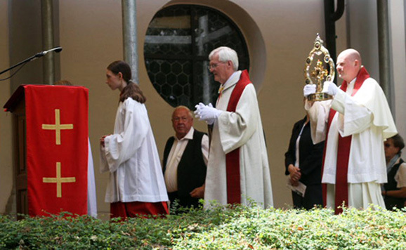 Gottesberg-Superior Pater Konrad Werder SDS geleitet den Gastprediger Pater Johannes Schmid O.Praem. an den Ambo. Pater Johannes trägt das Reliquiar. Er wie auch Pater Konrad tragen Pontifikalhandschuhe. Zum Schluss des Wortgottesdienstes spendete Pater Johannes mit der Heiligblut-Reliquie den Segen. Foto: Uli Gresser