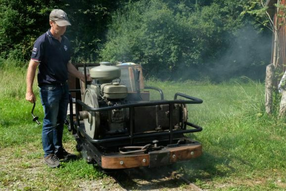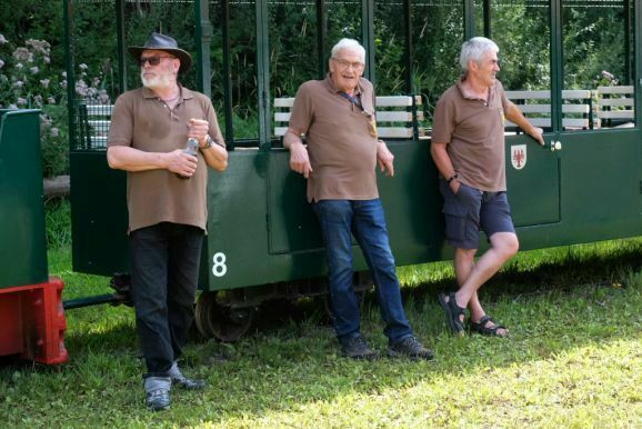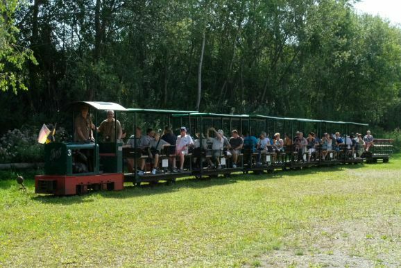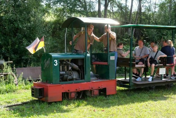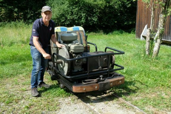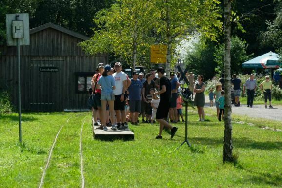 Denn als besondere Attraktaktion gab es in diesem Jahr eine Feldbahn zu bewundern, deren Urkonstruktion aus den 30er Jahren stammt, die bis in die 50er Jahre unverändert gebaut wurde und deren Schwungrad noch per Handkurbel aktiviert werden musste. Mit dieser Lok machten Lampeitel und seine Töchter den Geleitschutz für die „große“ Bahn, mit ihren zahlreichen Passagier-Loren, die im Stundenrhythmus wieder viele Passagiere zum Haidgauer Torfwerk beförderte.
