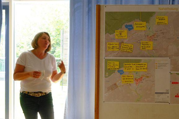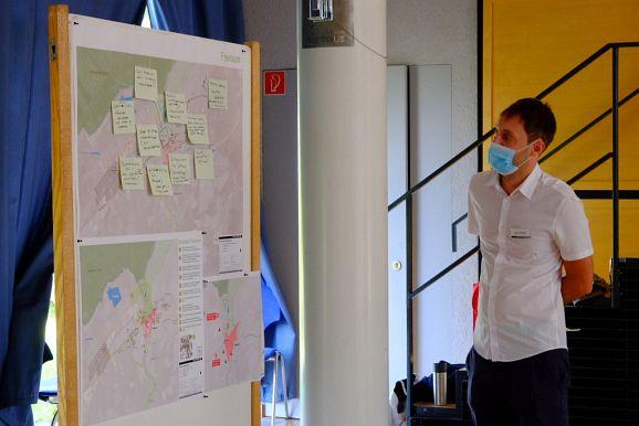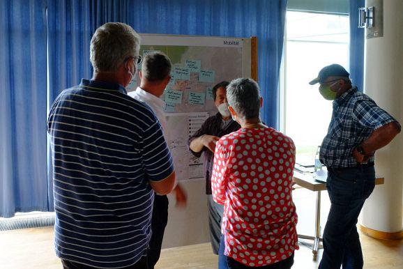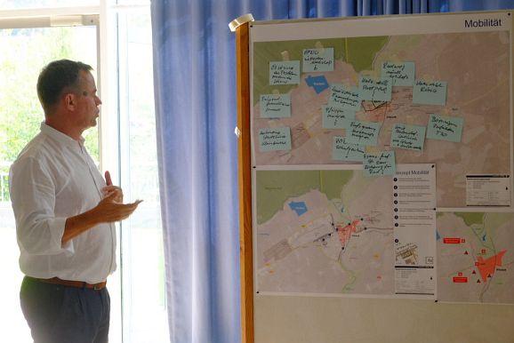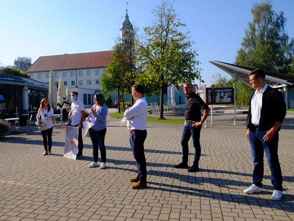 Moritz Weber, Dr. Bahareh Heydari von Planstatt Senner, Wolfgang Wahl von Rapp Trans, Bürgermeisterin Alexandra Scherer, Baurechtsexperte Andreas Haufler sowie Stadtbaumeister Matthäus Rude sammelten an verschiedenen Stationen beim abschließenden Workshop Ideen zu den Bereichen Mobilität, Bauliche Entwicklung, Freiräume, Soziales /Bildung, Naherholung und Tourismus und Sonstiges, auf deren Basis die beiden Planungsbüros ihre weiteren Schritte angehen können.