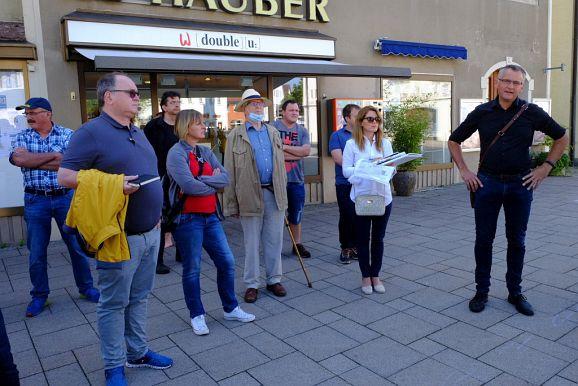 Bürgermeisterin Alexandra Scherer erläuterte dort, dass die von vielen Bürgern angemahnte Beschattung in Form von mobiler Begrünung bestellt sei. Etwas schwieriger gestaltete sich die Kommunikation bei der zweiten Station, dem Platz rund um den Marienbrunnen vor dem Rathaus, wo das Verkehrsdilemma deutlich wurde, wenn Redebeiträge teilweise wegen des vorbeifahrenden Verkehres unterbrochen mussten. Stadtbaumeister Matthäus Rude erklärte, dass eine eventuell angedachte Fußgängerzone für den Handel zum Problem werden können. Johann Senner stellte diesem ein gutes Zeugnis für den geringen Leerstand aus.