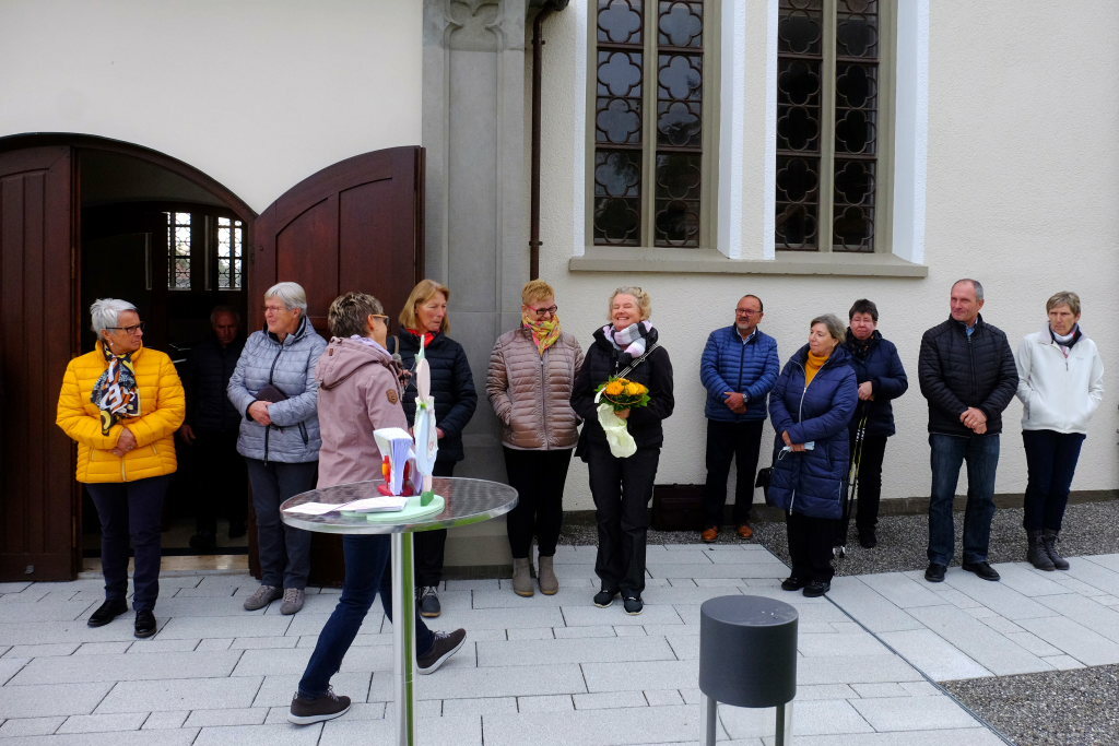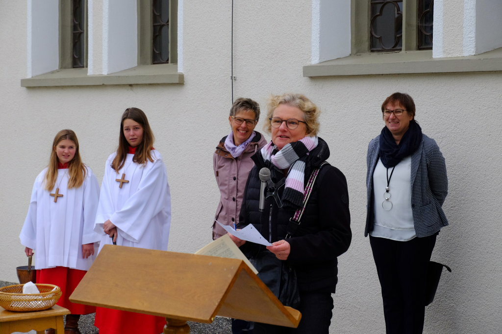 Diese eröffnete mit „Ein Haus voll Glorie schauet“ die Feier musikalisch ehe die zweite Vorsitzende des Kirchengemeinderates, Andrea Maucher, die Reihe der Ansprachen eröffnete. „Gut Ding will Weile haben, was lange währt wird endlich gut.“ Kaum ein Satz treffe besser auf die Arbeit des Kirchengemeinderates in den vergangenen fünf Jahren zu, der Neues mit dem Bestehenden in Einklang bringen musste. „Diese Zeit war nicht immer einfach,“ sagte sie. „Der Weg führt auf seiner ganzen Breite auf das Kirchenportal zu , Bänke laden zum Verweilen ein und im Frühjahr wenn die Blumenbeete erblühen kommt Farbe ins Spiel.“