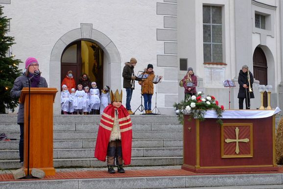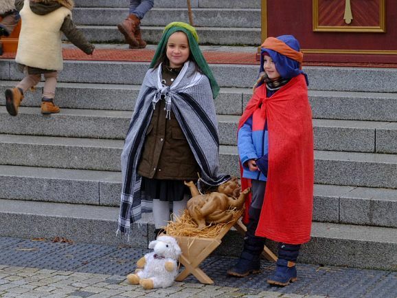 Unter der musikalischen Begleitung einer kleinen Abordnung der Stadtkapelle bei der Petra Springer, Dirigentin und Leiterin der Jugendmusikschule selbst zur Posaune griff, bot die Kinderkirche ein beeindruckendes Krippenspiel, das Pfarrerin Vollmer mit dem Beleuchten des das Hauptportal von St. Verena zierenden Christbaumes sowie dem Jubelgeläut der Kirchenglocken eröffnete.