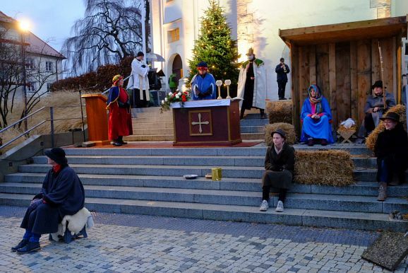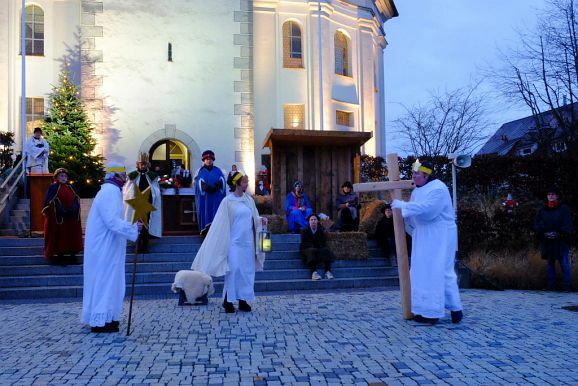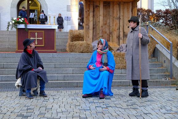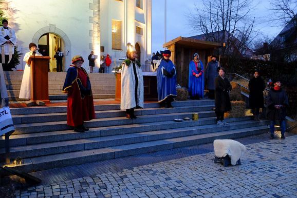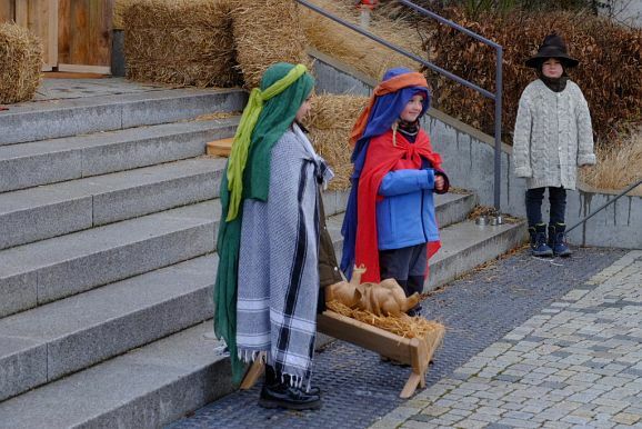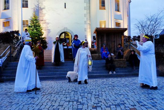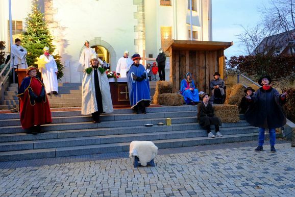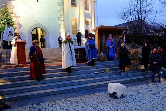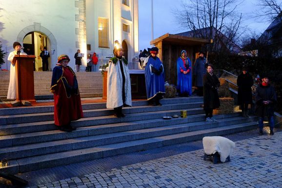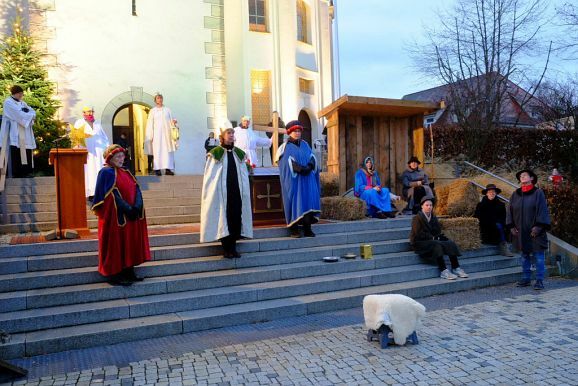 Bad Wurzach - Gleich zwei Krippenspiele bekamen die Besucher auf dem Klosterplatz an diesem Heiligabend auf dem Klosterplatz geboten. Jeweils unter der ökumenisch-geistlichen Begleitung von der evangelischen Pfarrerin Barbara Vollmer und dem Stadtpfarrer Stefan Maier führten zunächst die katholische Kinderkirche und danach die evangelische Frauengruppe ihre einstudierte Krippenspiele vor.