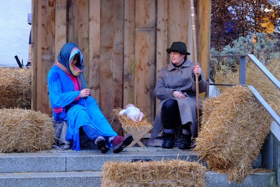 Dass nicht alles „eitel Sonnenschein“ an der Weihnachtsgeschichte ist, zeigt auch der Regieeinfall bei der Inszenierung der Frauengruppe: Ein Engel kommt zu spät zur Krippe, weil er als Geschenk bereits das auf die Passion hinweisende schwere Kreuz zu tragen hatte, wo ihm dabei natürlich niemand helfen wollte. Ihm sprang dann liebenswerterweise der Erzählhirte zum Weitertransport zur Seite.