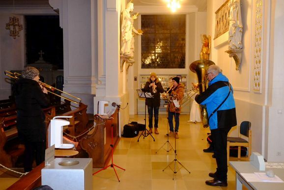 Zunächst lagen die Treppenstufen vom Klosterplatz zur St. Verena Kirche in fast völliger Dunkelheit, als die Bläserabordnung der Stadtkapelle um Petra Springer zum Einzug von Pfarrer und Ministranten aufspielte. Gemeinsam mit einigen Sängerinnen des Jugendchores unter der Leitung von Bernadette Vogt sorgten sie für den feierlichen musikalischen Rahmen.