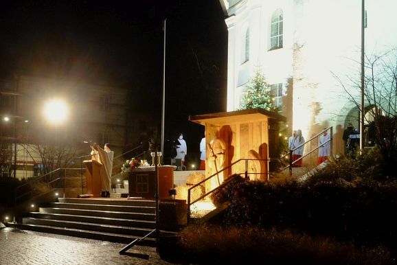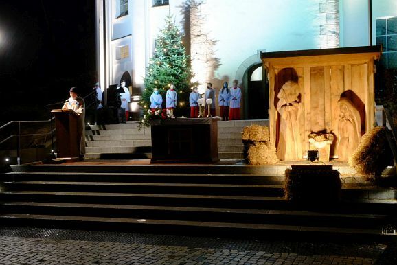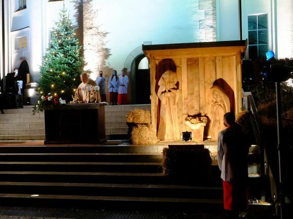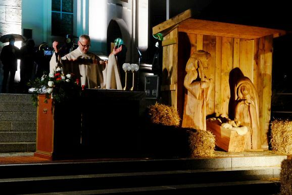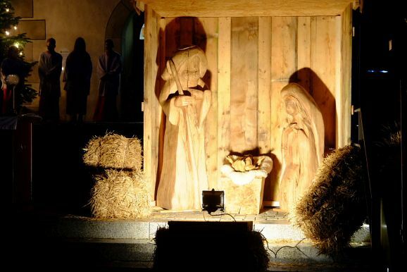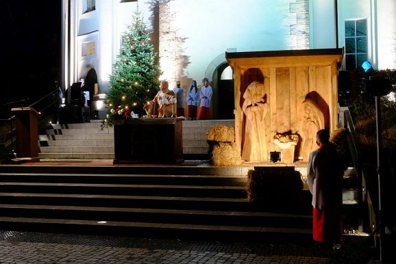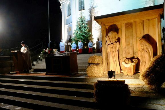 Nach und nach wurden – unter dem Weihnachtsläuten der Kirchenglocken – der auf den Stufen aufgebaute Altar, daneben die mit fast lebensgroßen Holzfiguren ausgestattete Krippe beleuchtet, sowie die Lichter des neben dem Kirchenportal aufgestellten Christbaumes eingeschaltet. Und zu guter Letzt wurden auch die großen Strahler in Betrieb genommen, mit denen dank vieler Sponsoren an den Adventswochenenden der Kirchturm effektvoll beleuchtet wurde (die Aktion wurde über die Weihnachtsfeiertage verlängert).