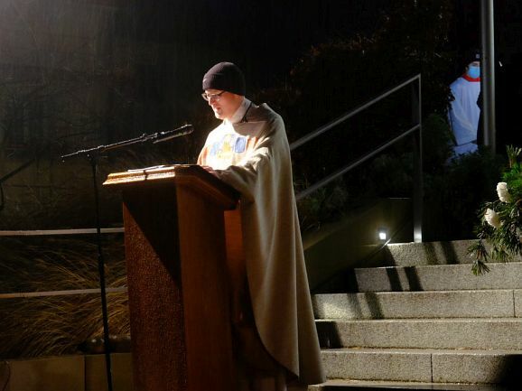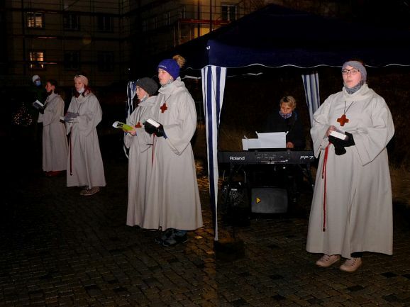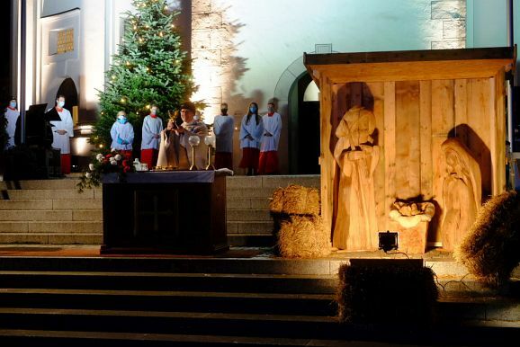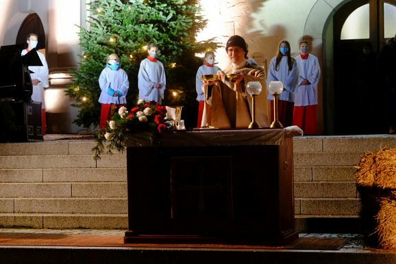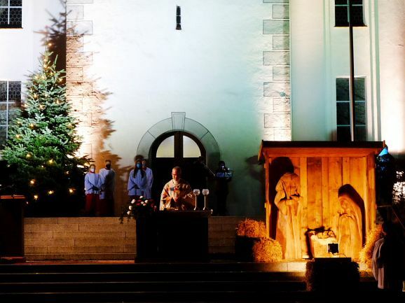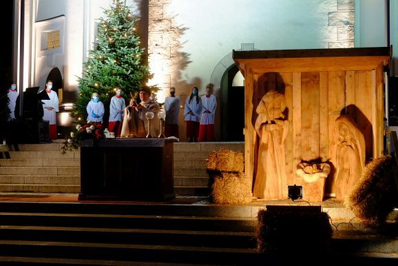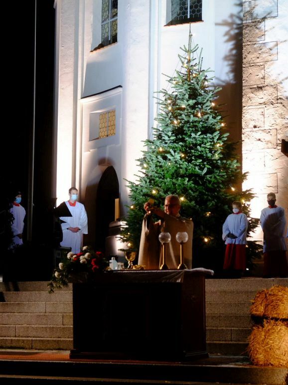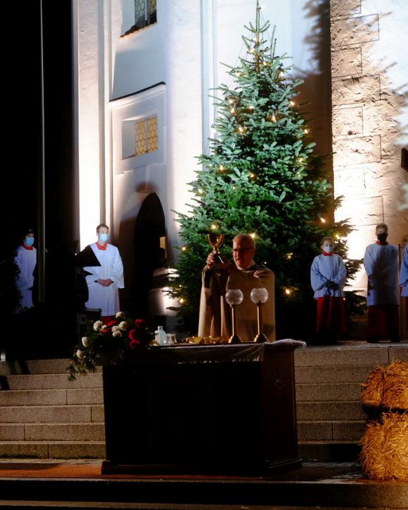 Allen Widrigkeiten zum Trotz, nach fast frühlingshaften Temperaturen am Vortag, blies ein widrigkalter Wind den ganzen Nachmittag und Abend viele Regenschauer über den Klosterplatz, harrten die zahlreich gekommenen Gottesdienstbesucher gerne aus, um die besondere Atmosphäre dieser außergewöhnlichen Heiligen Nacht zu genießen, natürlich verbunden mit der Hoffnung, dass bis zur nächsten Weihnacht die Pandemie und ihre Folgen der Vergangenheit angehört. Denn etwas vermissten alle Besucher schmerzlich: