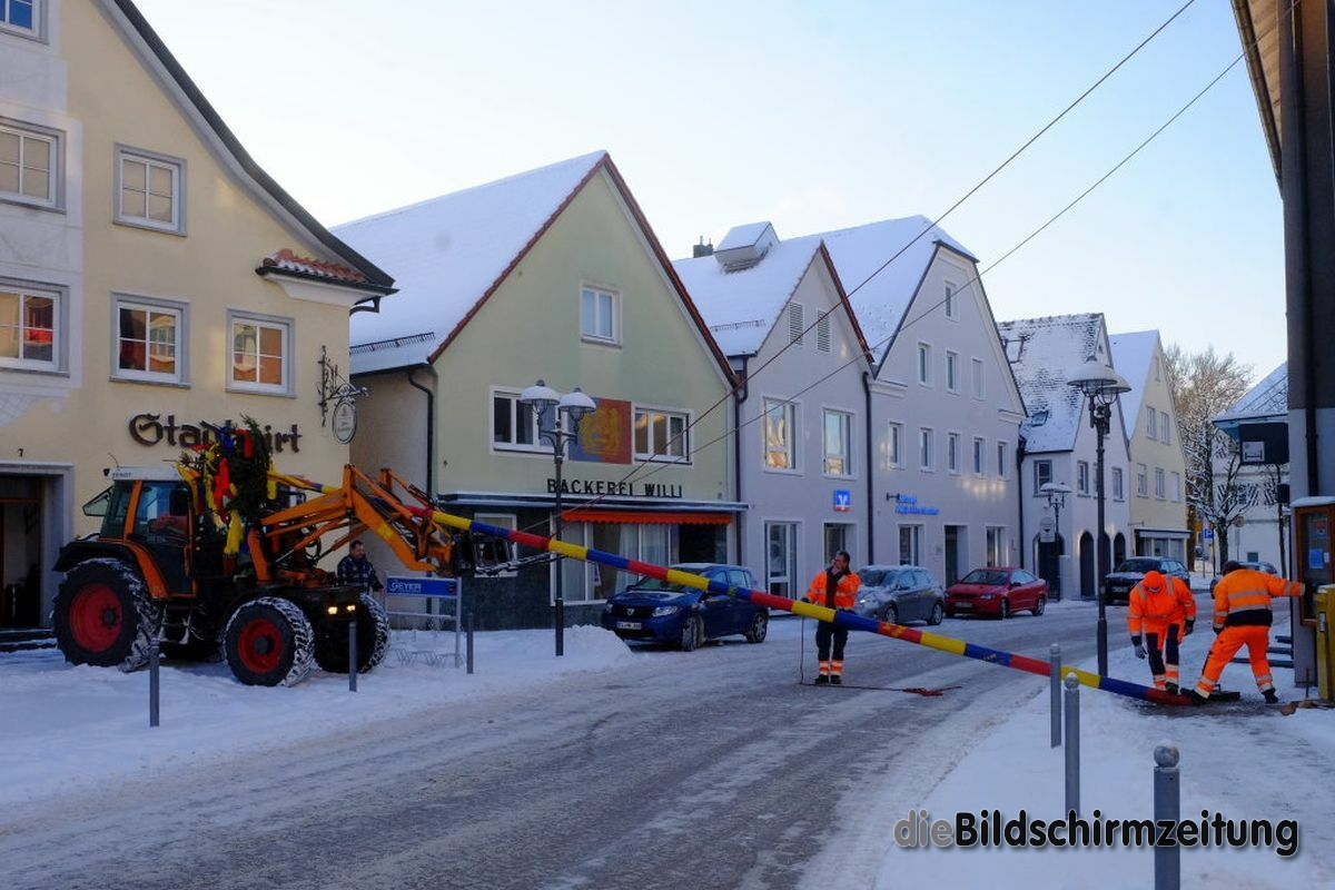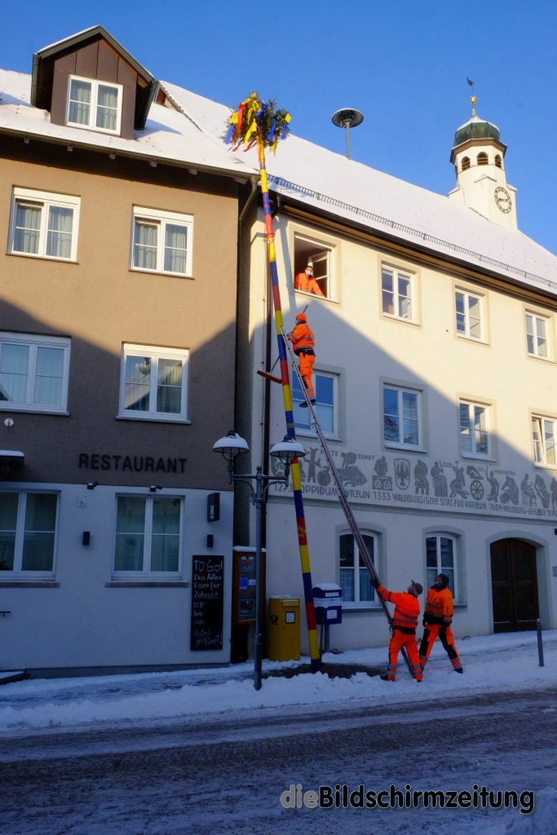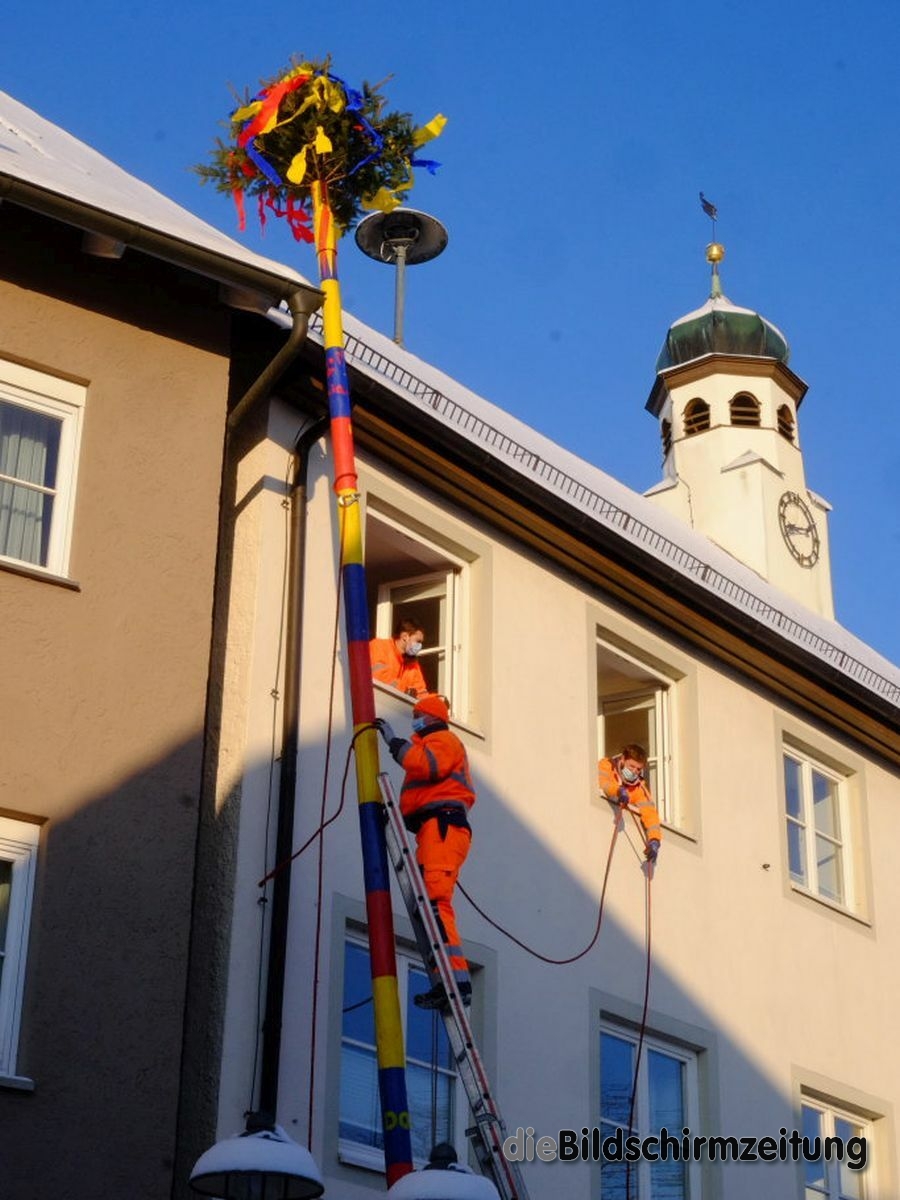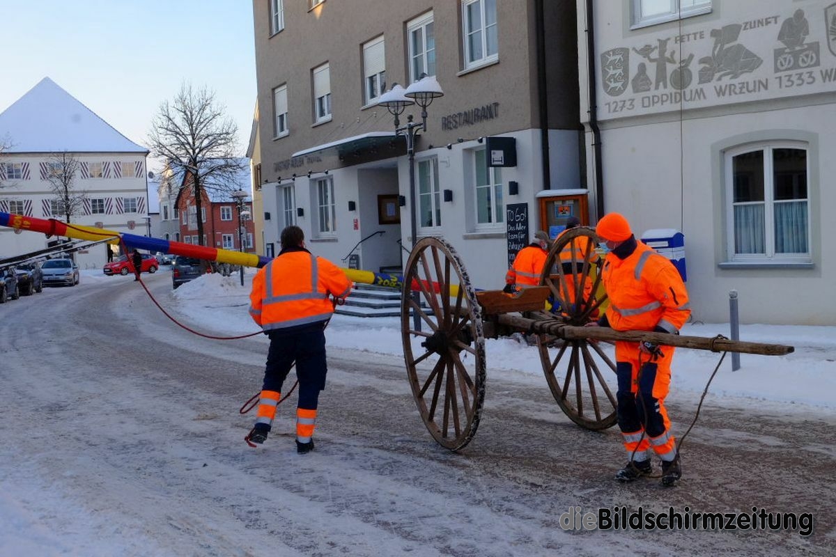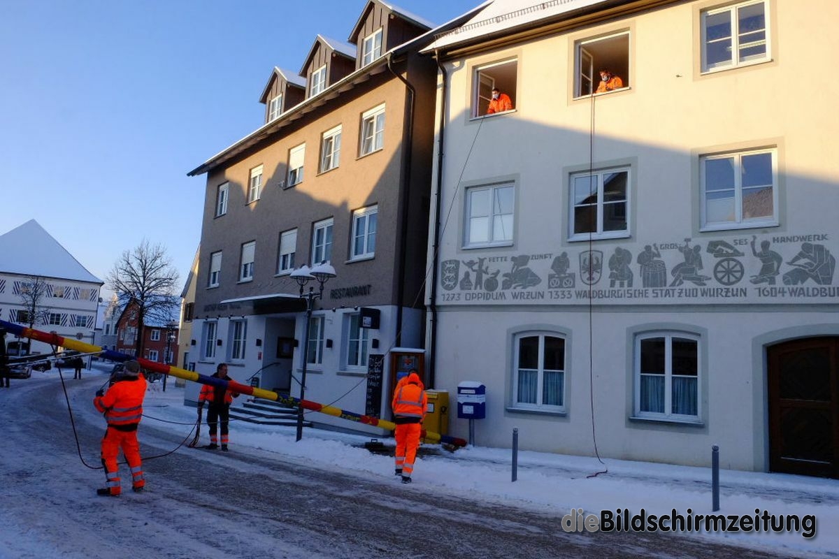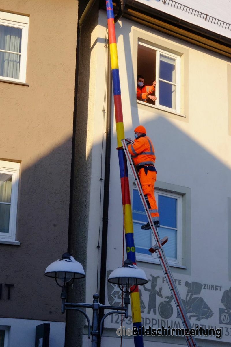 Bad Wurzach - Bürgermeisterin Alexandra Scherer hat Wort gehalten: Sechs Mitarbeiter des städtischen Bauhofes hoben, schoben und zogen den Narrenbaum am Morgen des Gumpigen Donnerstag 2021 an seinen angestammten Platz beim Rathaus.