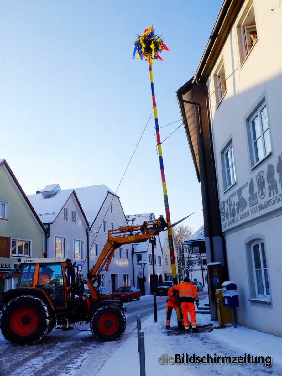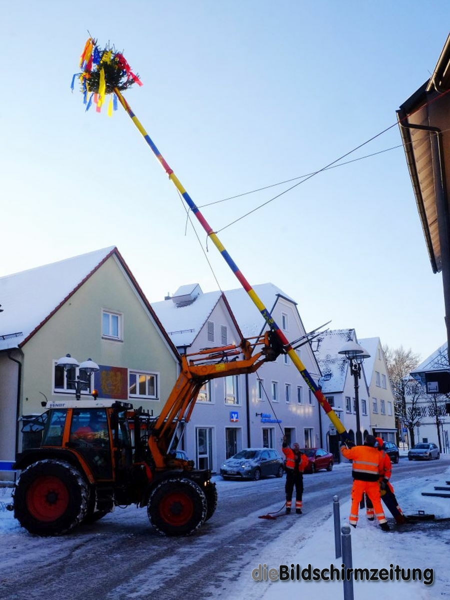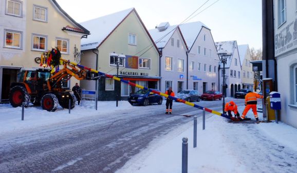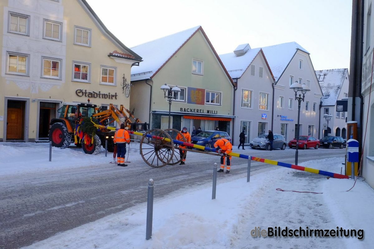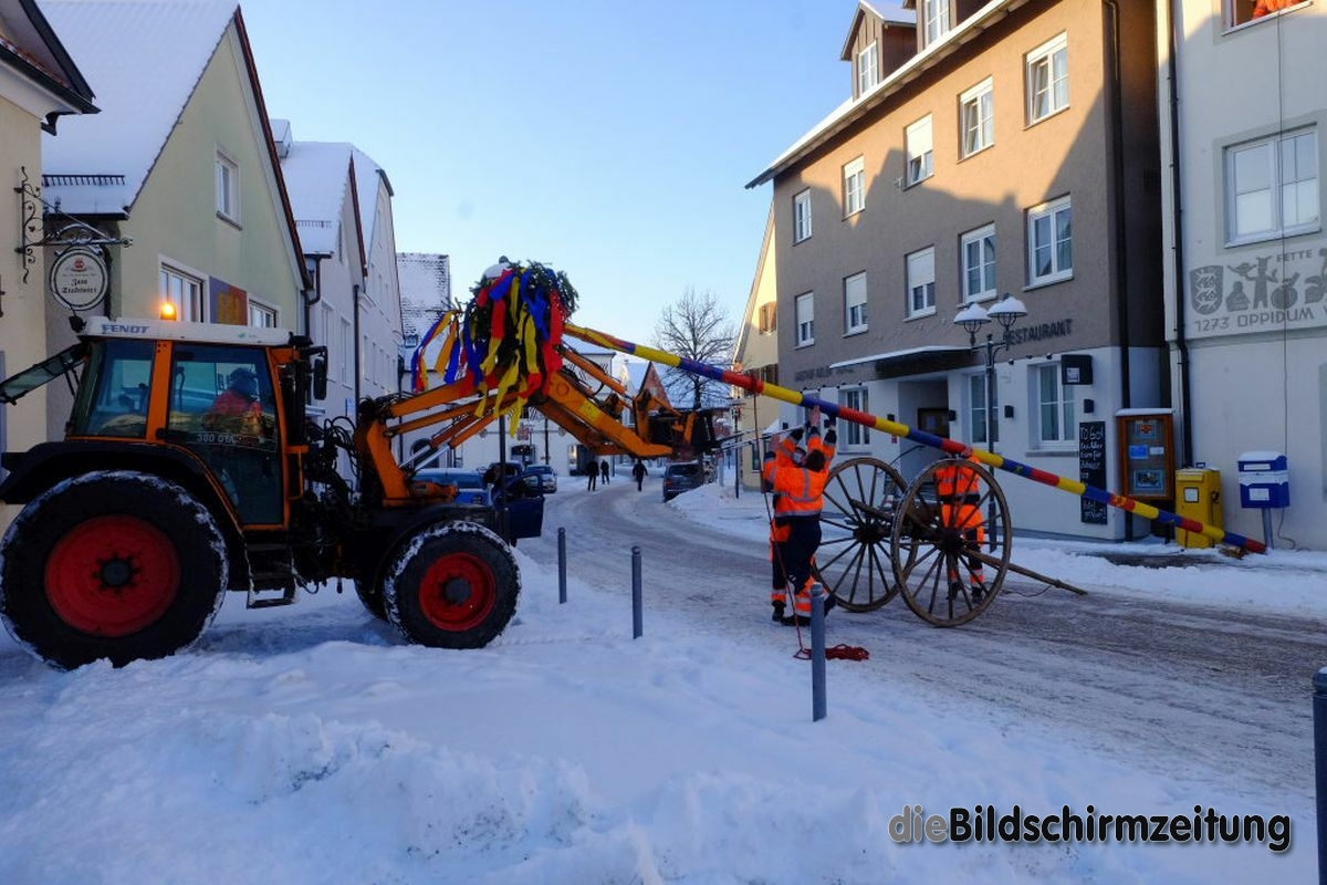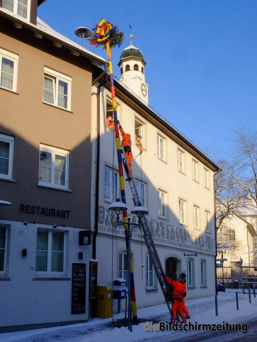 Bad Wurzach - Bürgermeisterin Alexandra Scherer hat Wort gehalten: Sechs Mitarbeiter des städtischen Bauhofes hoben, schoben und zogen den Narrenbaum am Morgen des Gumpigen Donnerstag 2021 an seinen angestammten Platz beim Rathaus.