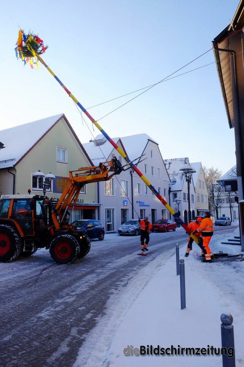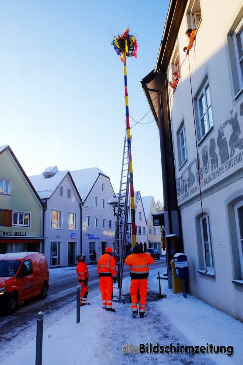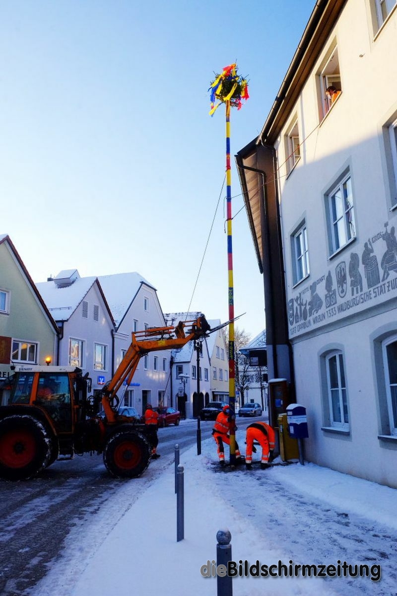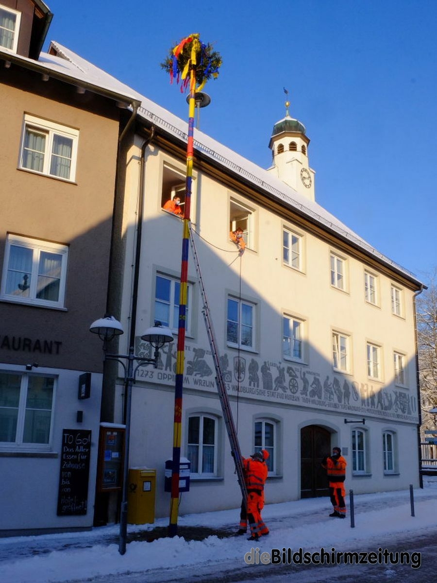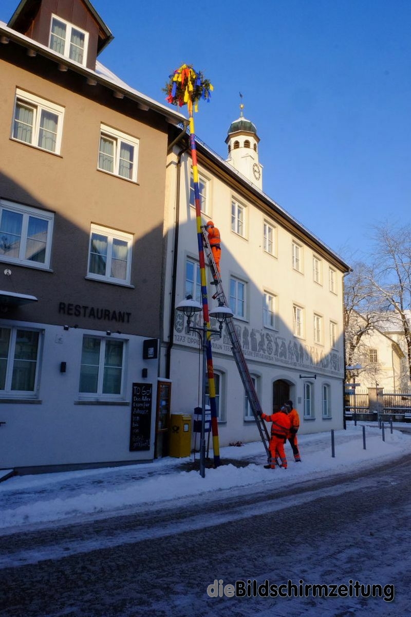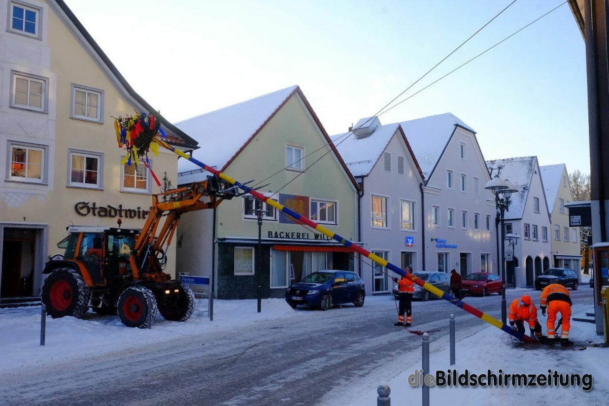 Bad Wurzach - Bürgermeisterin Alexandra Scherer hat Wort gehalten: Sechs Mitarbeiter des städtischen Bauhofes hoben, schoben und zogen den Narrenbaum am Morgen des Gumpigen Donnerstag 2021 an seinen angestammten Platz beim Rathaus.