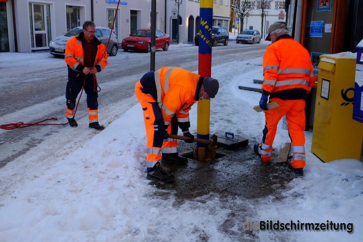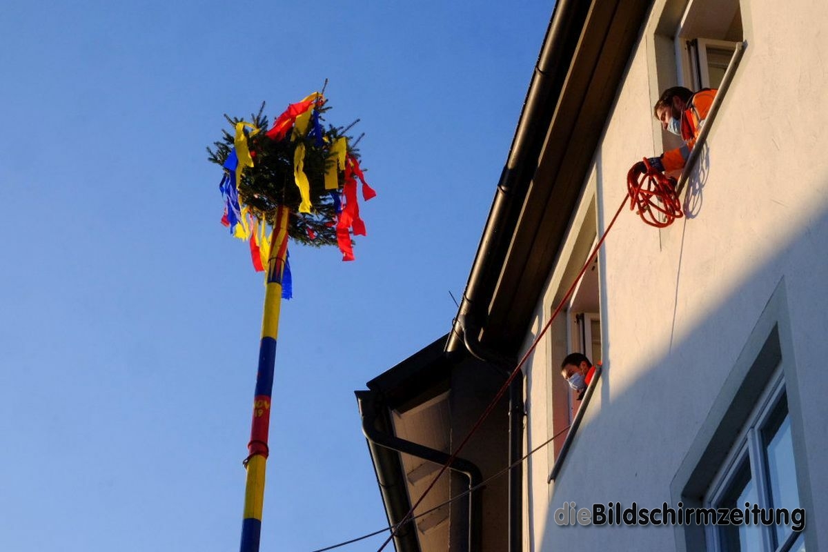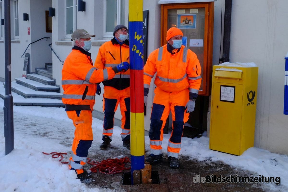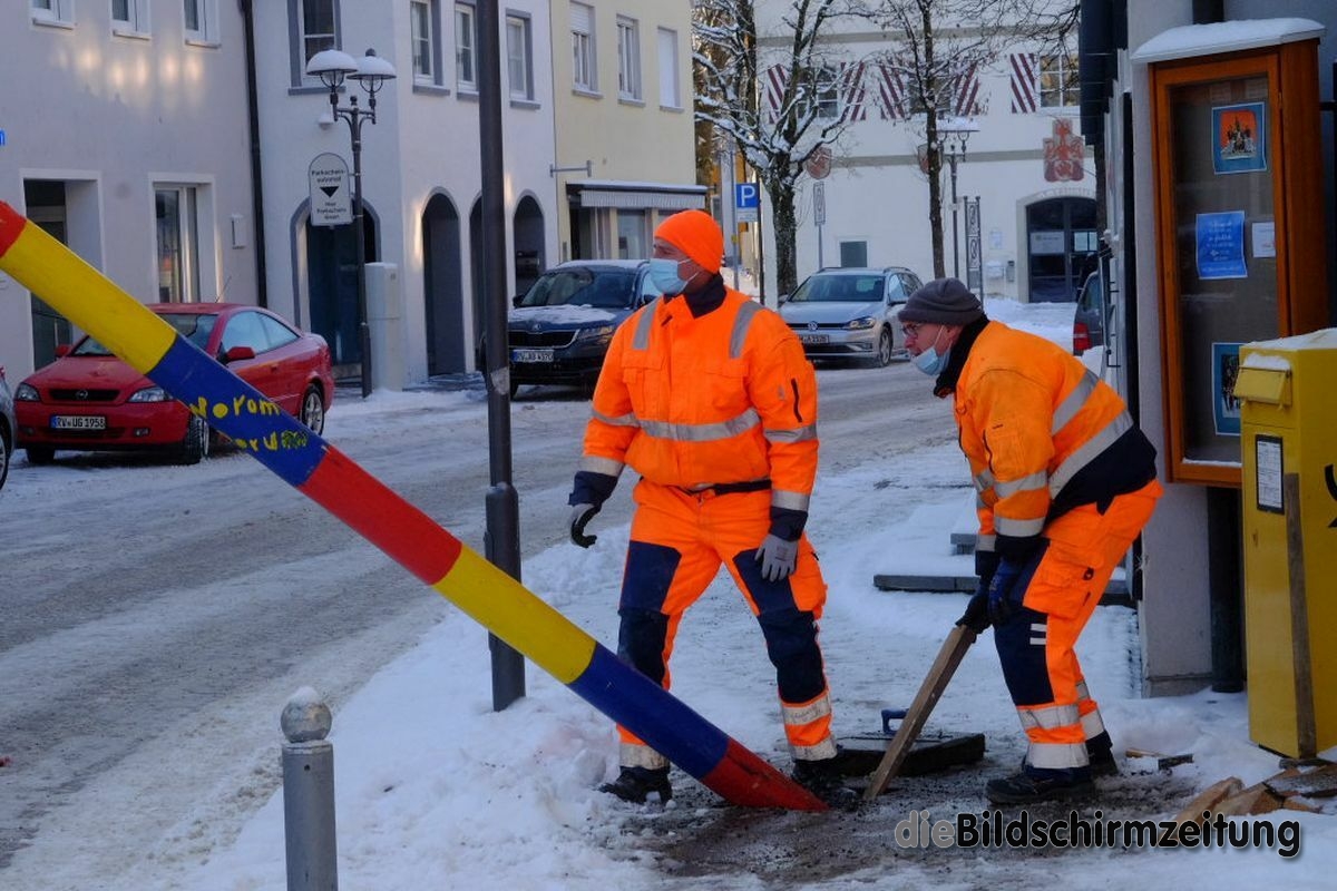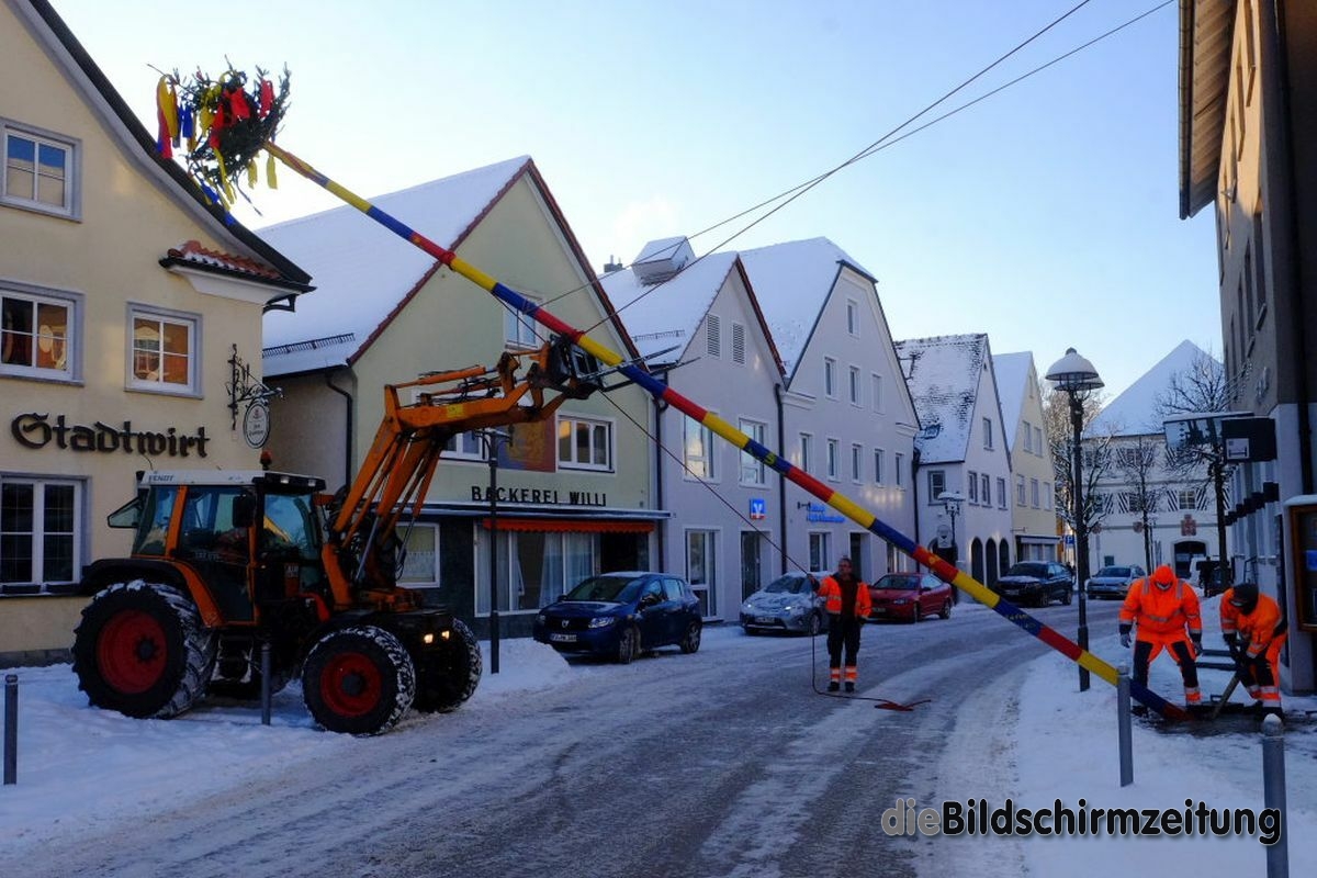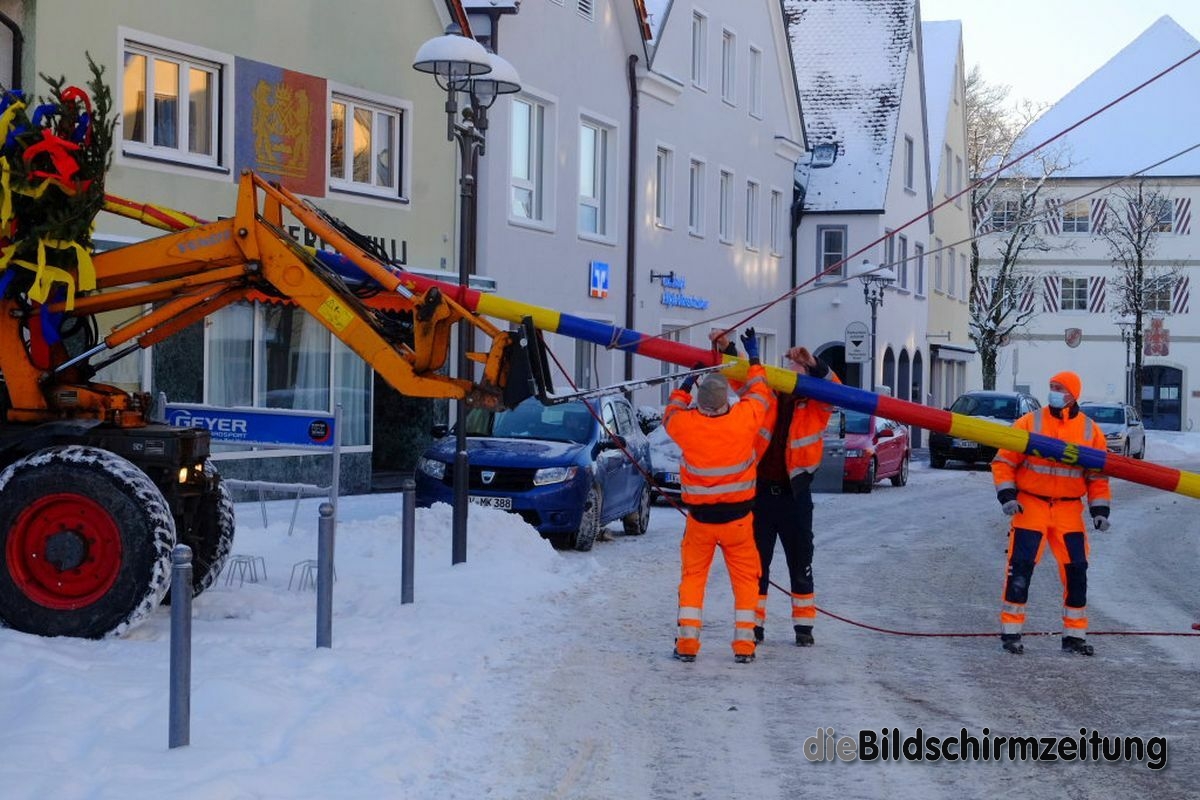 Bad Wurzach - Bürgermeisterin Alexandra Scherer hat Wort gehalten: Sechs Mitarbeiter des städtischen Bauhofes hoben, schoben und zogen den Narrenbaum am Morgen des Gumpigen Donnerstag 2021 an seinen angestammten Platz beim Rathaus.