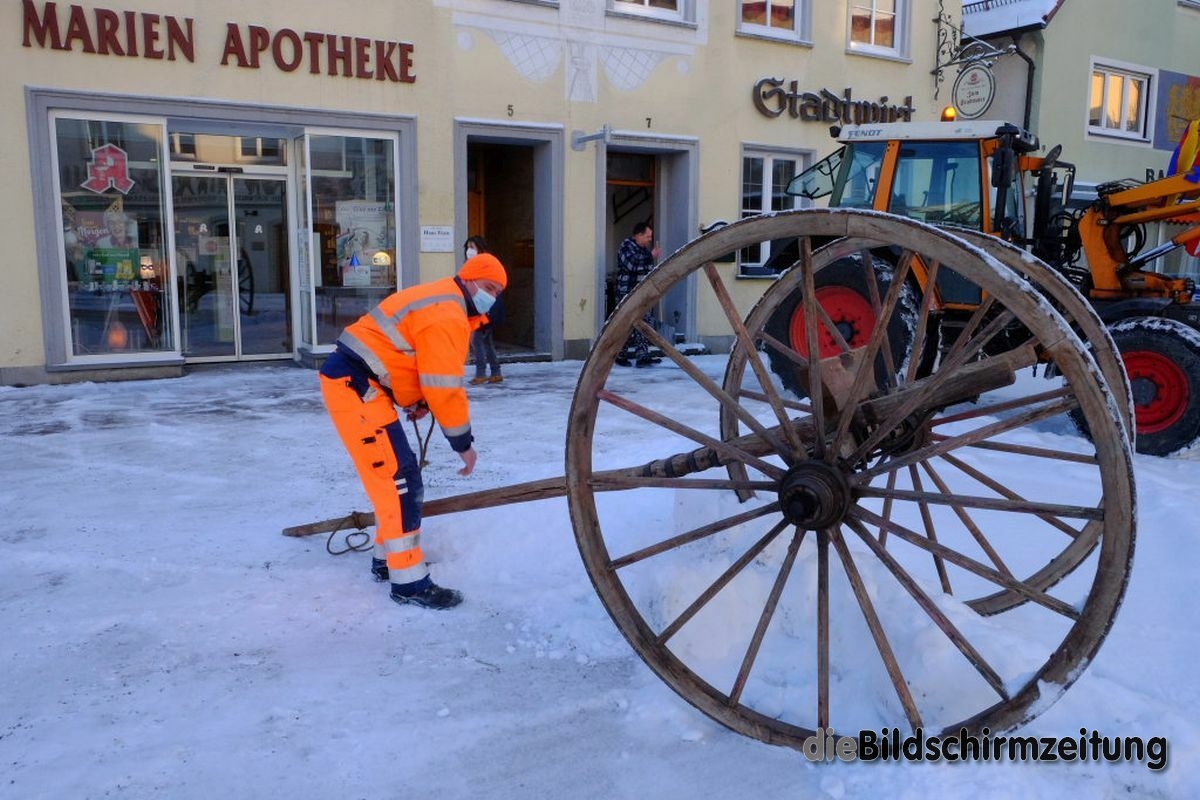 Es ehrt die Bürgermeisterin und den Bauhof, dass dieser trotz seiner großen Belastung durch den Winterdienst – es hatte in der Nacht zuvor noch einmal kräftig geschneit – das Versprechen eingehalten hat, so dass für eine Woche die Insignie der Narretei beim Rathaus stehen kann.