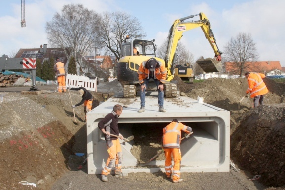 Die aus insgesamt fünf Modulen bestehende Fertigbaubrücke wurde von der Firma Rinninger in Kisslegg vorgefertigt und „Just in time“ am Dienstagmorgen per Tieflader angeliefert. Ein Autokran hievte nacheinander die Einzelteile, in die große Natursteine als Bachbettsimulation mit eingegossen wurden, an den Ort ihrer Bestimmung. Mit Fingerspitzengefühl und ein wenig Muskelkraft bugsierten die Mitarbeiter der mit der Erschließung beauftragten Firma Strabag exakt an den vorher vorbereiteten richtigen Platz im neuen Bachbett.