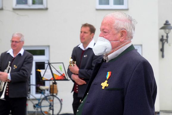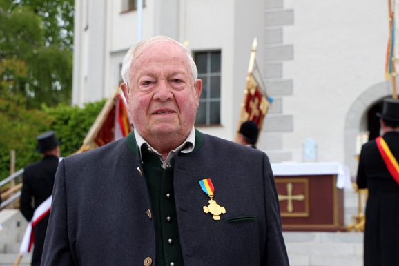 Alois Fimpel, Ehrenbürger der Stadt Bad Wurzach und beim Heilig-Blut-Fest seit Urzeiten für die Organisation des Blumenschmuckes am Heiligblutwagen und die Sitzbänke auf dem Gottesberg verantwortlich, hatte seinen Abschied angekündigt. „Alois Fimpel hat seit er mit 10 Jahren erstmals mitreiten durfte sein ganzes Leben dem Heilig-Blut-Fest gewidmet, “ sagte Scherer in ihrer Laudatio.