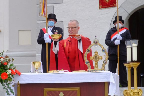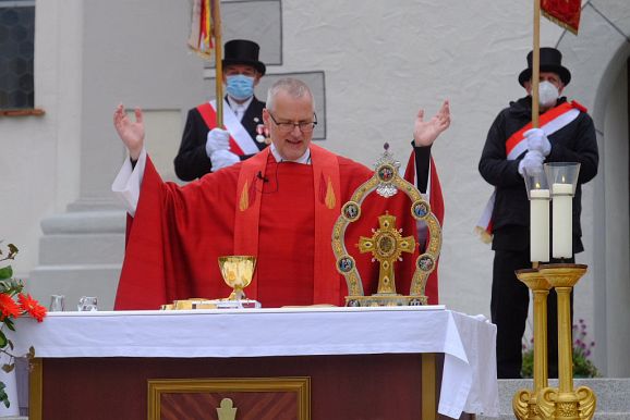 In seiner Predigt wies Pfarrer Maier auf die Verbindung zwischen Pfingsten und Heiligblutfest hin. Gott habe um die Welt zu retten, seinen Sohn hingegeben. Er verglich die Kirche mit einem Schiff, dessen Mast das Kreuz sei. Dabei müsse der Mast aufgerichtet sein, damit der Wind in das Segel blasen könne und das Schiff dadurch aufs Meer und in die Zukunft geführt werden könne.